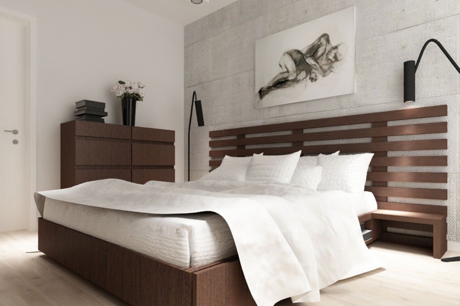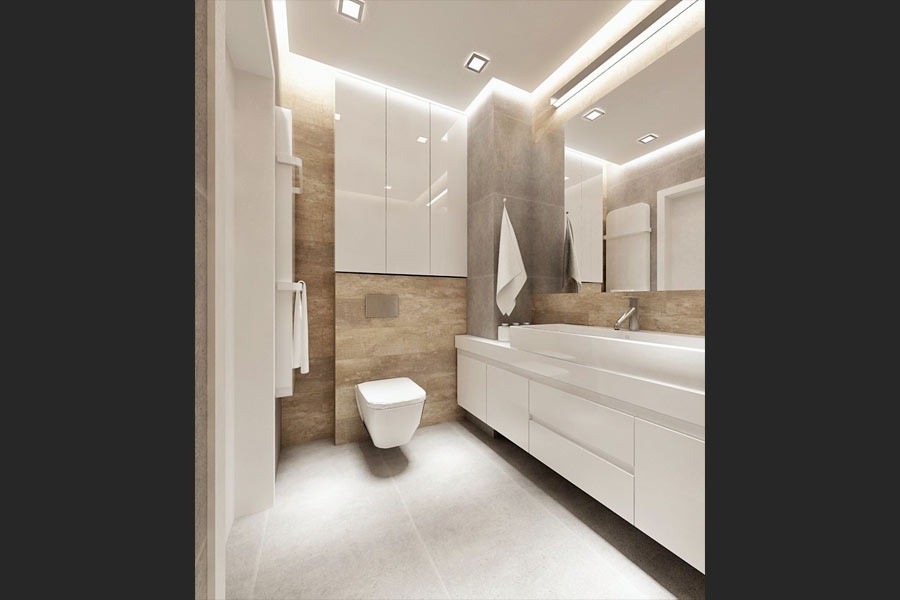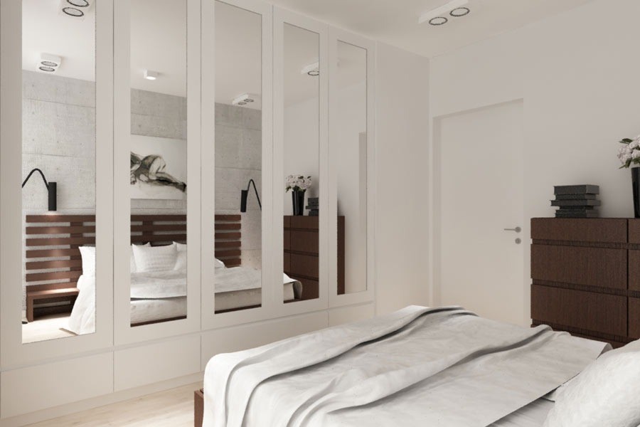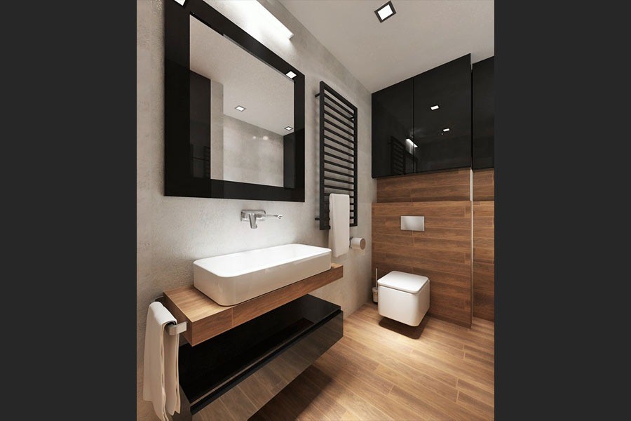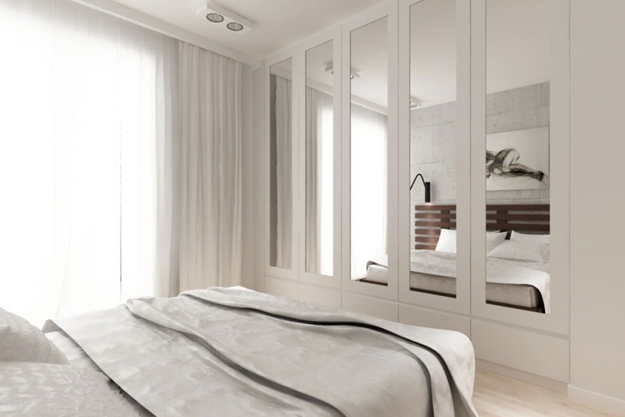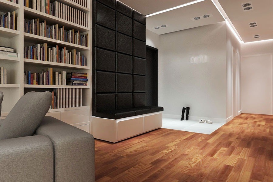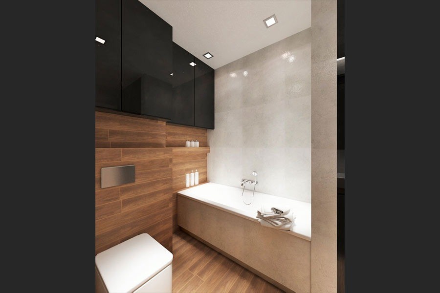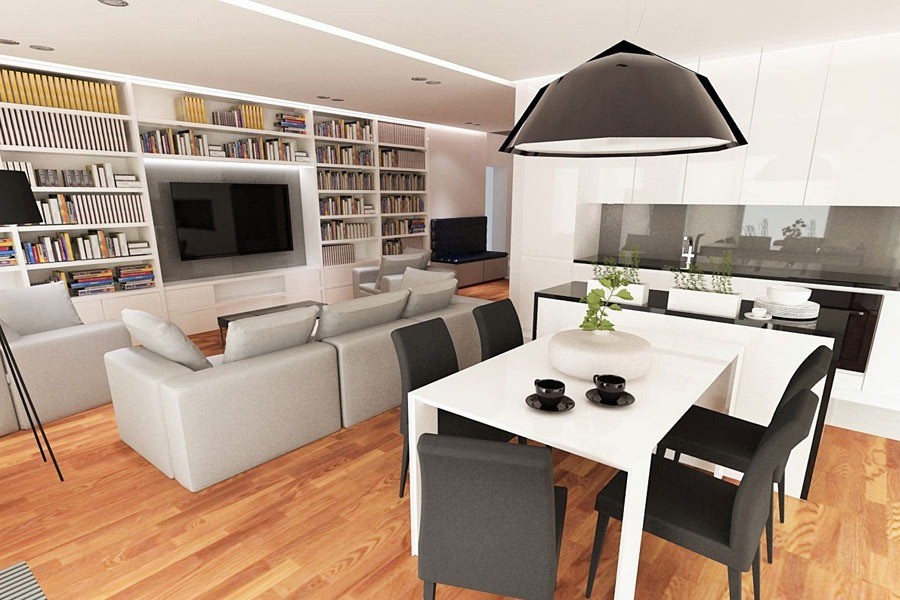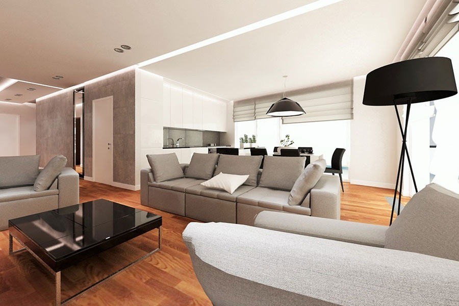 Aranżacja wnętrz tego mieszkania została powierzona doświadczonemu projektantowi wnętrz z firmy Modify. Projektanci postawili na nowoczesny styl, który charakteryzuje się prostymi bryłami oraz kontrastem między szarościami i czernią a ciepłymi odcieniami miodowego drewna. To połączenie nadaje wnętrzom elegancji i jednocześnie przytulności.