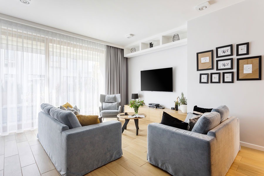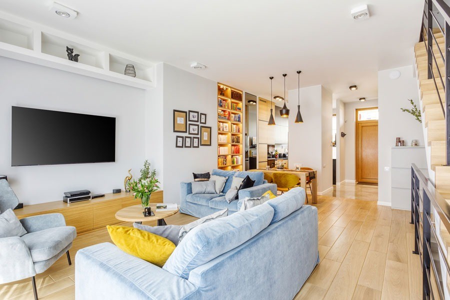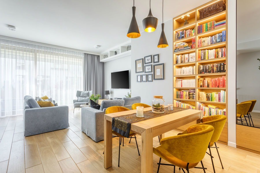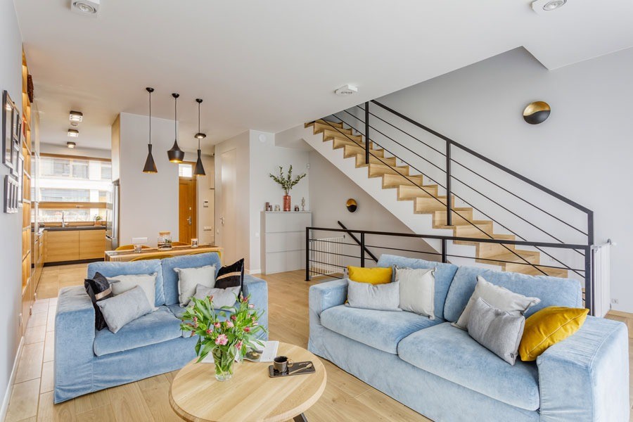 Salon, będący drugim ważnym miejscem w mieszkaniu, został zaprojektowany tak, aby łączyć nowoczesność z przytulnością. Wygodne sofy zapewniają komfortowy wypoczynek, a ciekawa część jadalniana stanowi idealne miejsce do spożywania posiłków i spotkań z bliskimi. Kolorystyka i styl salonu są spójne z resztą mieszkania, co nadaje całości harmonijnego charakteru.