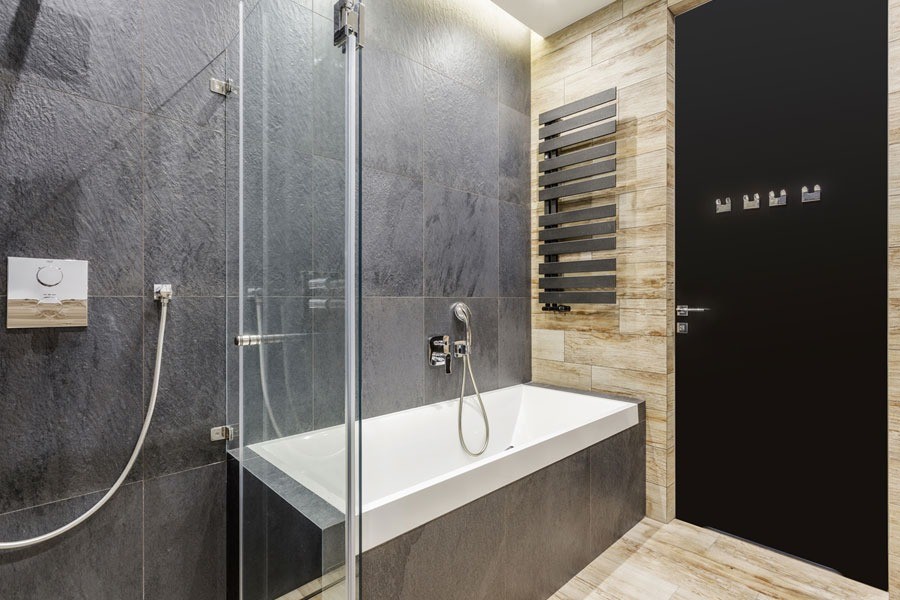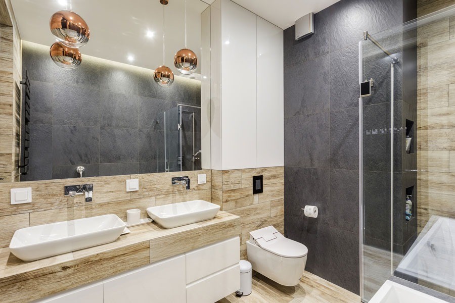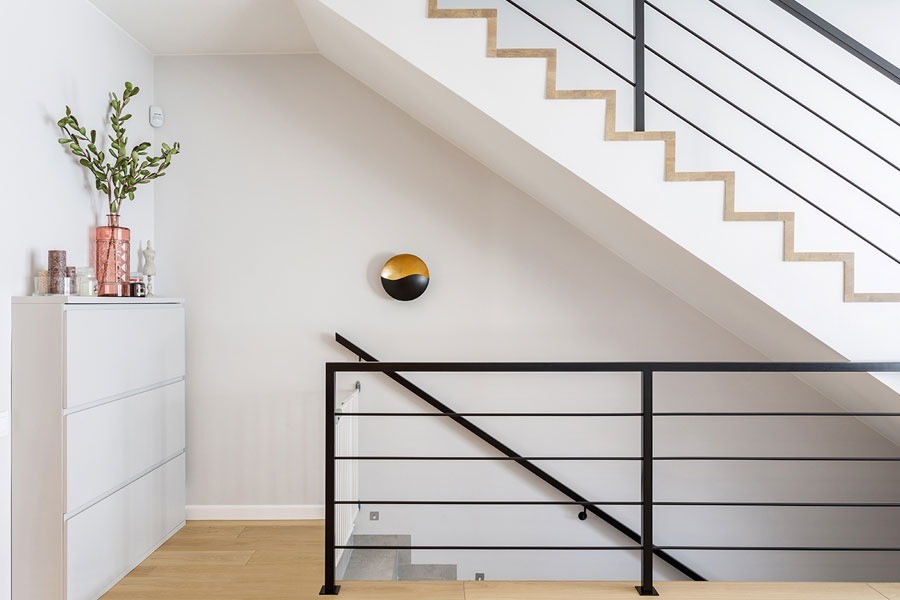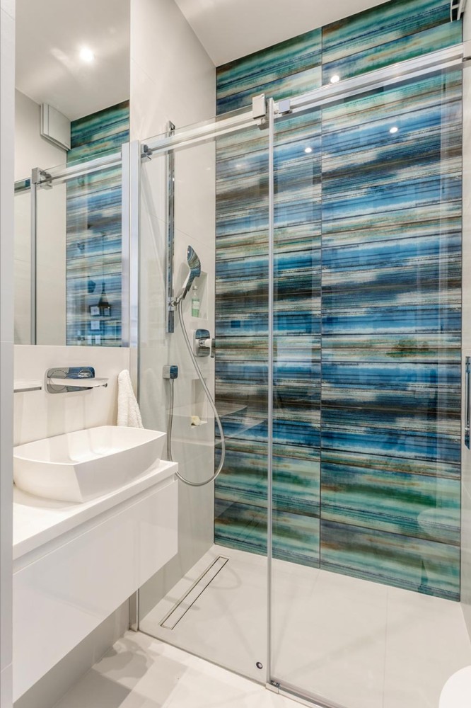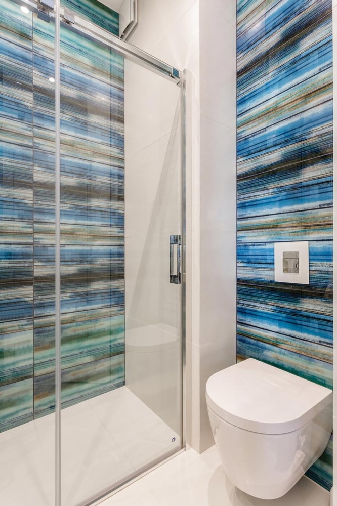 Łazienka na parterze utrzymana jest w nowoczesnym stylu. Biel, przełamana kolorem szklanych płytek, tworzy efektowny kontrast i dodaje pomieszczeniu świeżości. Zarówno aranżacja, jak i wybór materiałów są perfekcyjnie dopasowane do reszty mieszkania, co sprawia, że całość prezentuje się spójnie i harmonijnie.
