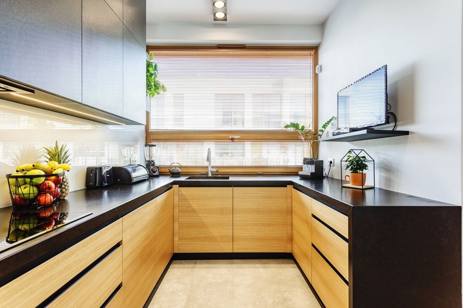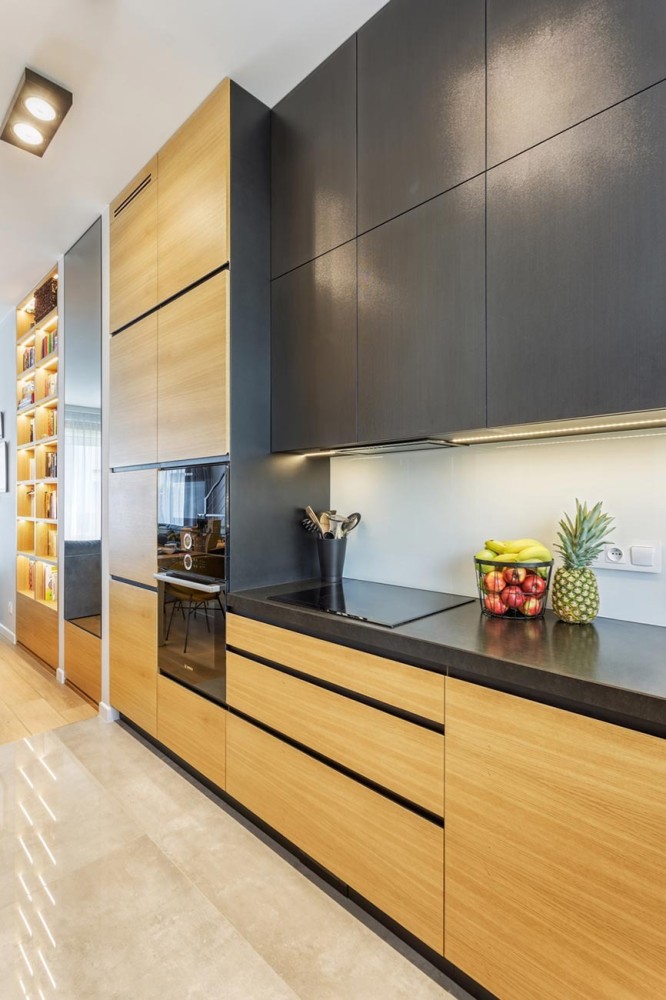 Projekt mieszkania na Mokotowie o powierzchni 120m2 to doskonały przykład harmonijnego połączenia naturalnego drewna z nowoczesnymi elementami. Całe wnętrze zostało zaprojektowane w taki sposób, aby zapewnić maksymalnie wykorzystaną przestrzeń i stworzyć komfortowe warunki do życia. Kuchnia, będąca sercem domu, została urządzona w sposób funkcjonalny i elegancki. Przemyślana aranżacja umożliwia maksymalne wykorzystanie dostępnej przestrzeni na przechowywanie. Dodatkowo blat roboczy wykonany z czarnego granitu nadaje pomieszczeniu wyjątkowego charakteru. Kontrast między drewnem a czarnymi powierzchniami i dodatkami tworzy unikalną atmosferę, która odzwierciedla nowoczesne podejście do aranżacji wnętrz.
