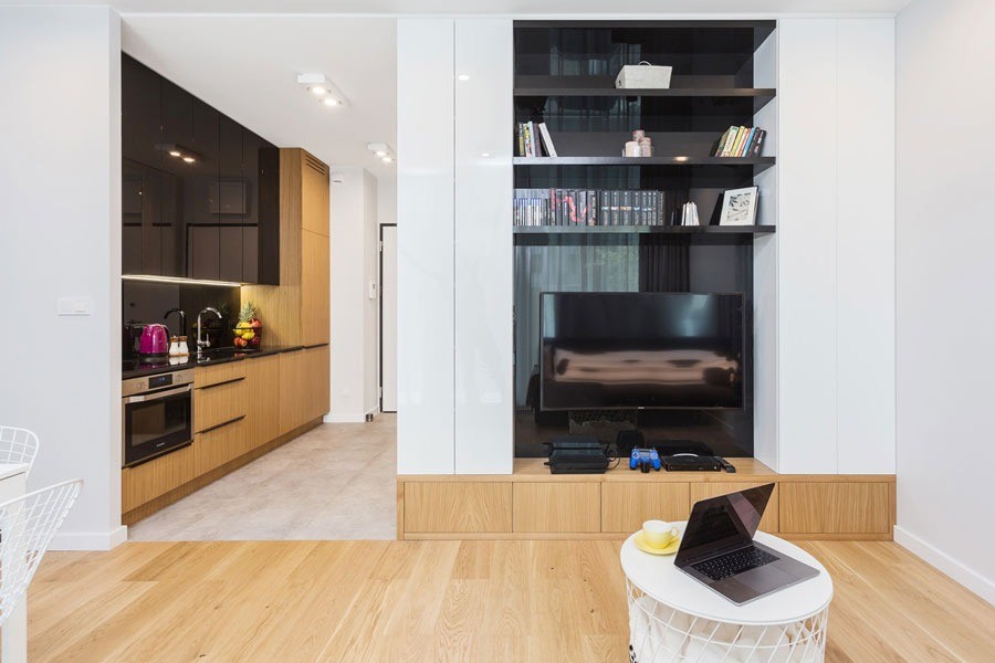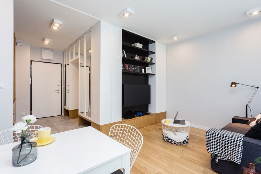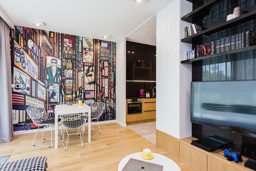 Projektant wnętrz zaprojektował kawalerkę na Żoliborzu w Warszawie, idealną dla studenta, w nowoczesnym stylu. Inwestorzy postawili na prostotę, ale jednocześnie byli otwarci na ciekawe rozwiązania. W aranżacji salonu zastosowano tapetę, która dodaje charakteru pomieszczeniu. Jej wzór i kolory stanowią interesujący element dekoracyjny, który przyciąga uwagę i nadaje wnętrzu unikalny charakter.