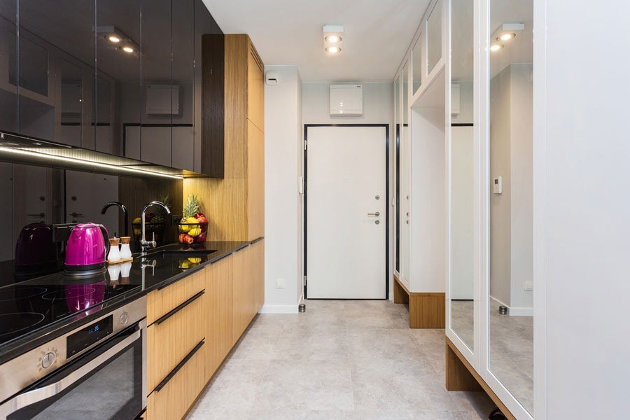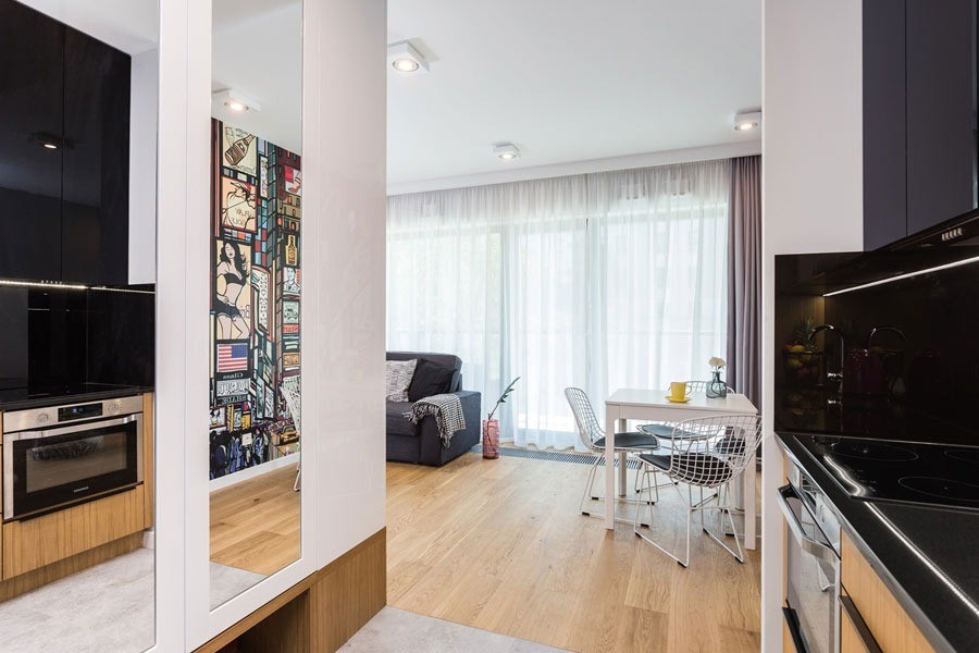 Niewielkie wymiary mieszkania stanowiły wyzwanie dla projektanta przy projektowaniu kuchni. Wnęka na aneks kuchenny została wykorzystana maksymalnie. Blat roboczy wykonany z czarnego granitu nie tylko prezentuje się elegancko, ale także jest praktyczny i trwały. Dzięki temu mieszkanie na Żoliborzu zyskało funkcjonalne i piękne miejsce do gotowania i przygotowywania posiłków.