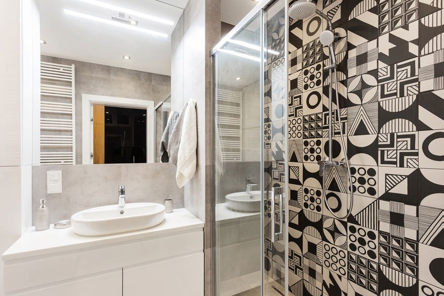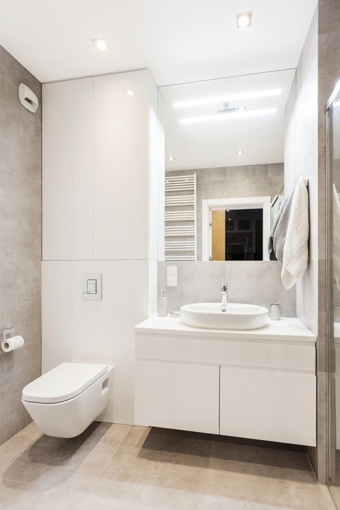 Łazienka również została zaprojektowana w taki sposób, aby maksymalnie wykorzystać dostępną przestrzeń. Mimo niewielkich rozmiarów znalazło się tam miejsce na spory prysznic z odpływem w posadzce. Dodatkowo łazienka mieści pralkę oraz wiele szafek, które umożliwiają przechowywanie niezbędnych artykułów higienicznych i kosmetyków. Wprowadzenie takiego rozwiązania sprawia, że łazienka jest nie tylko funkcjonalna, ale także estetyczna i przyjazna dla użytkownika.