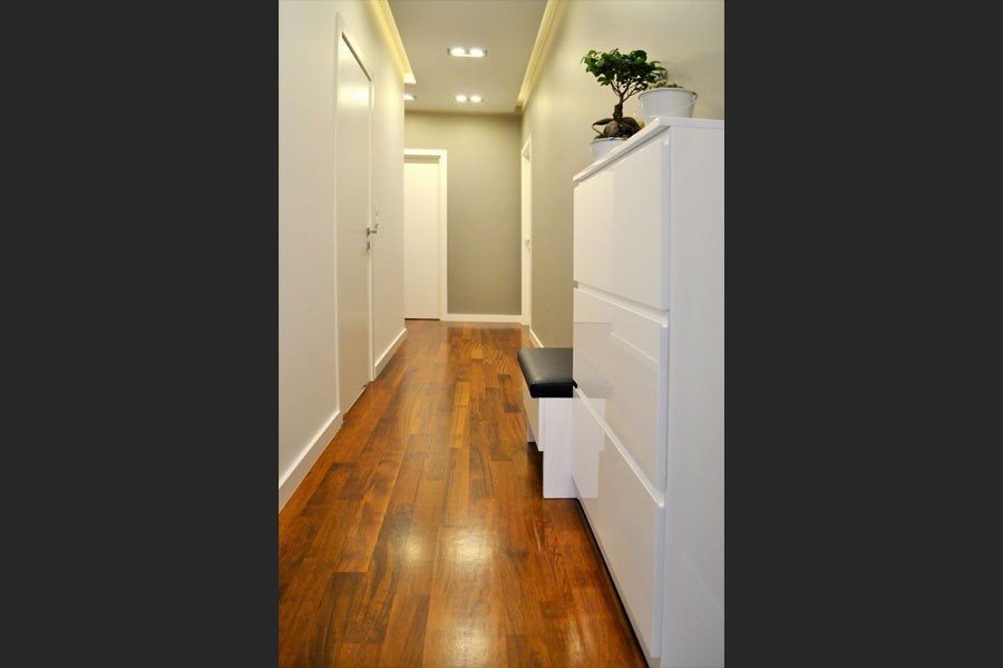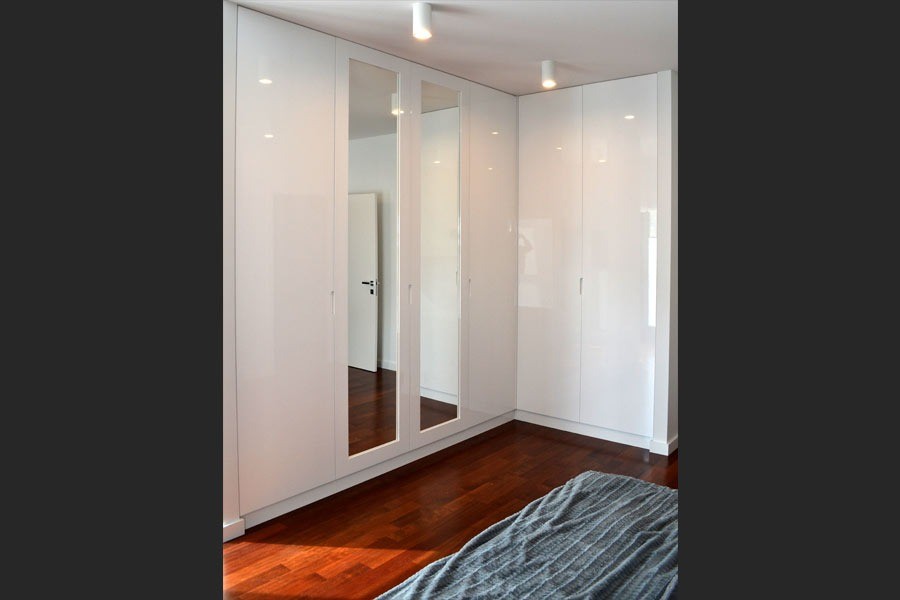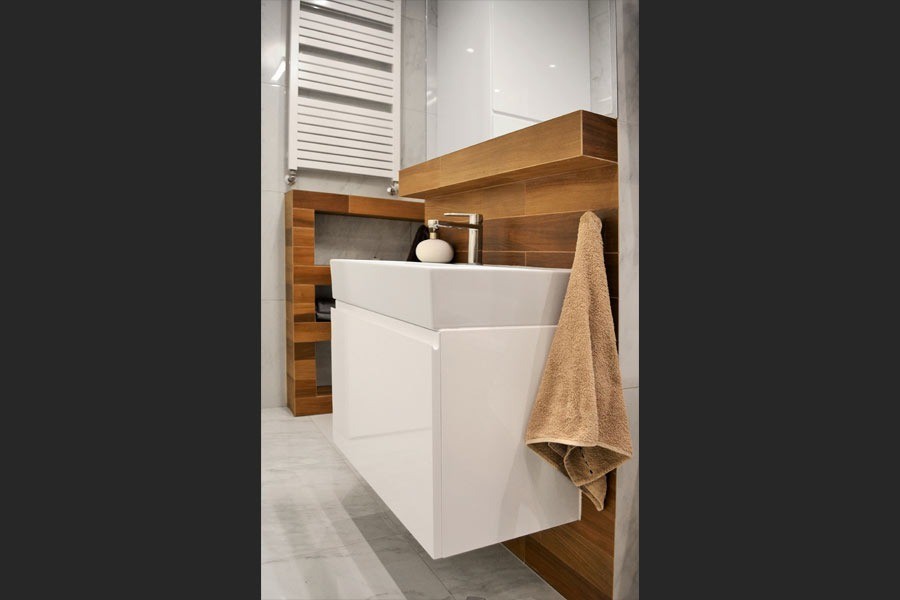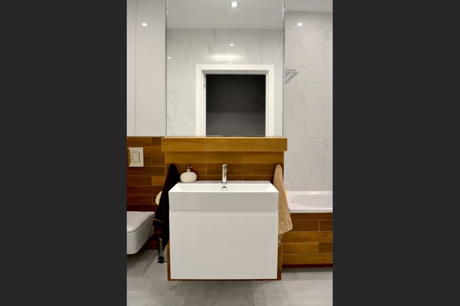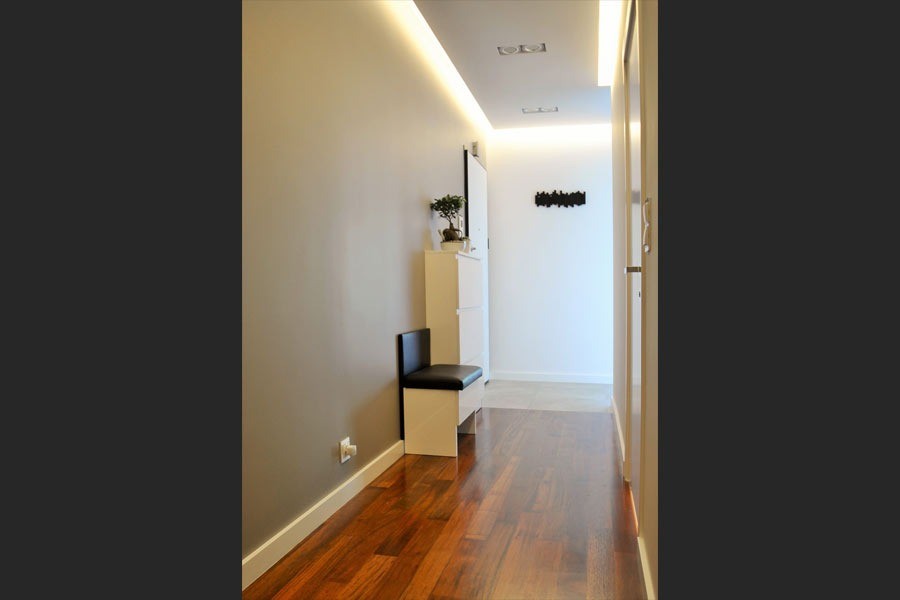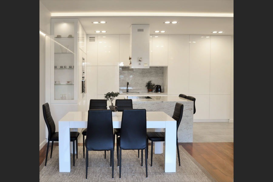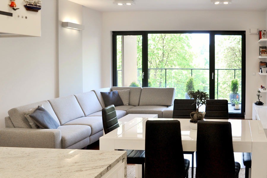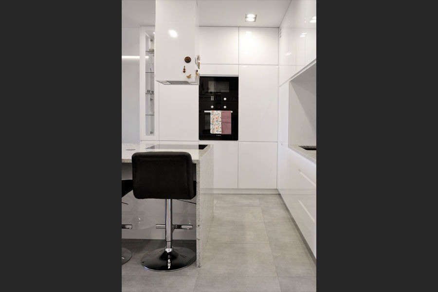 Projekt mieszkania na Żoliborzu o powierzchni 103m² został przygotowany przez firmę Modify z Warszawy. Projektanci wnętrz postawili na nowoczesny styl, w którym dominują białe polerowane meble oraz kamienne blaty w kuchni. Jasna kolorystyka wnętrza została przełamana piękną podłogą z litej deski merbau, dodając przytulności i ciepła pomieszczeniom.