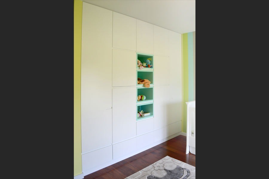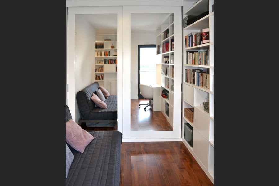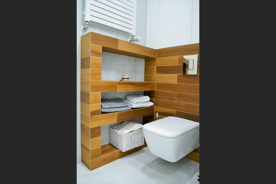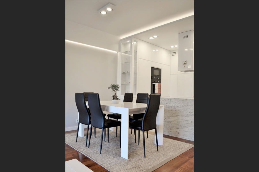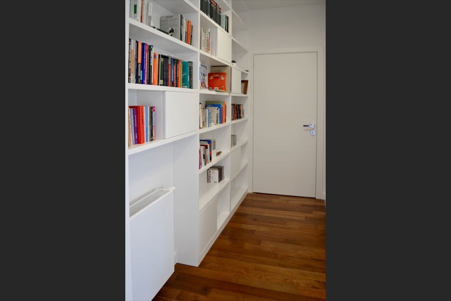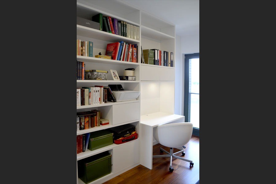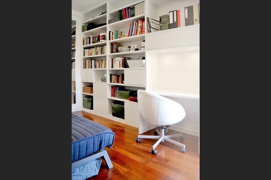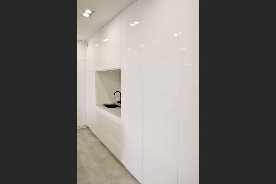 Projekt mieszkania na Żoliborzu o powierzchni 103m² został przygotowany przez firmę Modify z Warszawy. Projektanci wnętrz postawili na nowoczesny styl, w którym dominują białe polerowane meble oraz kamienne blaty w kuchni. Jasna kolorystyka wnętrza została przełamana piękną podłogą z litej deski merbau, dodając przytulności i ciepła pomieszczeniom.
