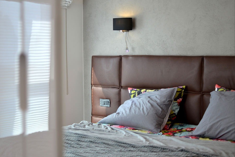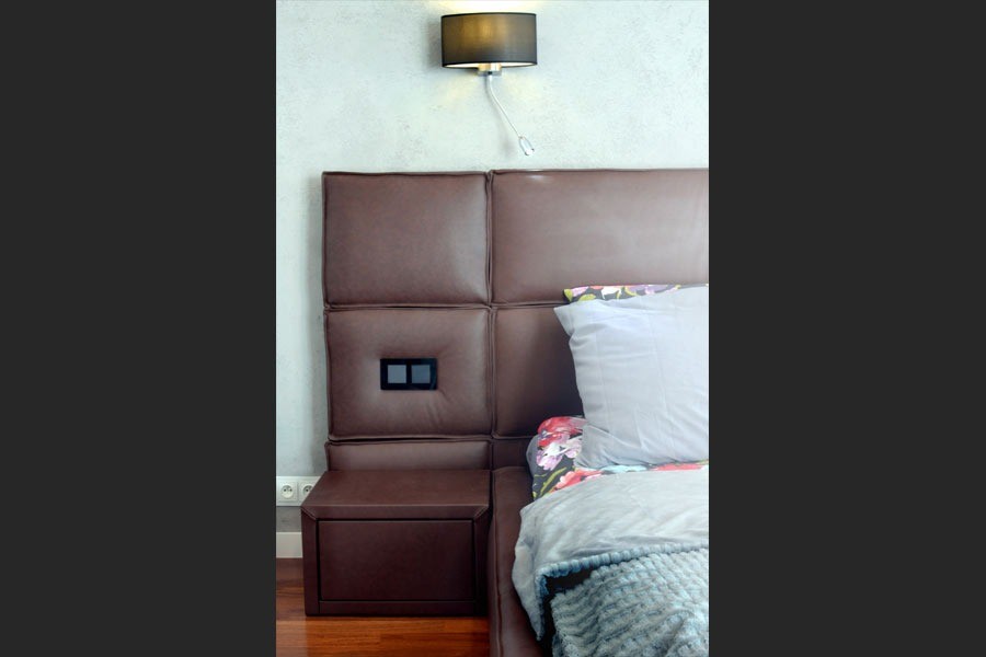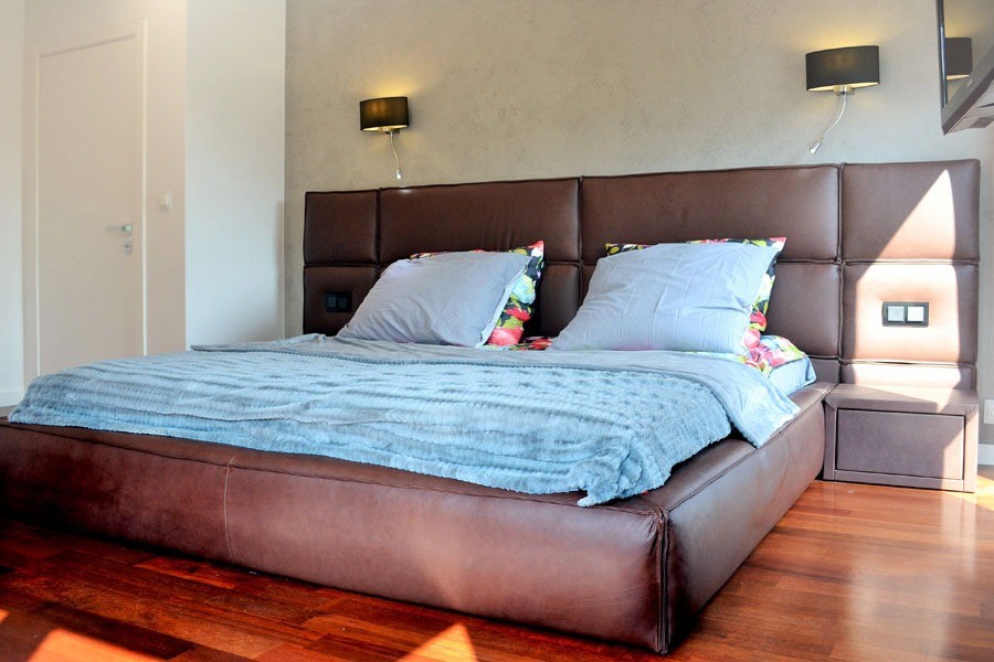 Niezwykłą uwagę projektanci poświęcili sypialni. W tym pomieszczeniu znajduje się duże, skórzane łóżko, które jest centralnym punktem aranżacji. To miejsce odpoczynku, zapewniające wygodę i komfort po całym dniu. Dodatkowo przestronne szafy w sypialni umożliwiają przechowywanie ubrań i innych przedmiotów w estetyczny i funkcjonalny sposób.
