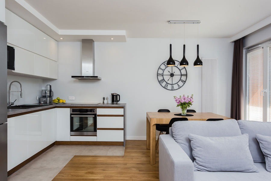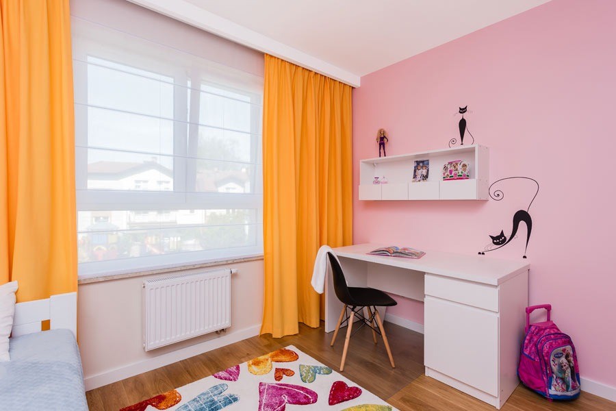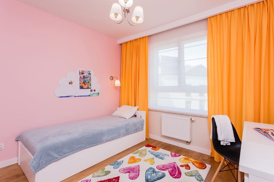To mieszkanie o powierzchni 107 m2 kwadratowych jest nie tylko estetyczne, ale także funkcjonalne. Składa się z salonu z aneksem kuchennym, długiego przedpokoju, czterech sypialni, dwóch łazienek i pralni. Każde z tych pomieszczeń zostało starannie zaplanowane, aby spełniać potrzeby i oczekiwania rodziny. Salon z aneksem kuchennym jest sercem tego mieszkania. To przestronne pomieszczenie zapewnia wygodną przestrzeń do spędzania czasu razem. Wykorzystanie drewna w meblach i podłodze nadaje mu ciepłą atmosferę, a jednocześnie wpisuje się w nowoczesny styl. Duże okna wpuszczają dużo światła dziennego, co sprawia, że salon wydaje się jeszcze bardziej przestronny i przyjemny.