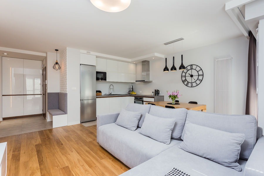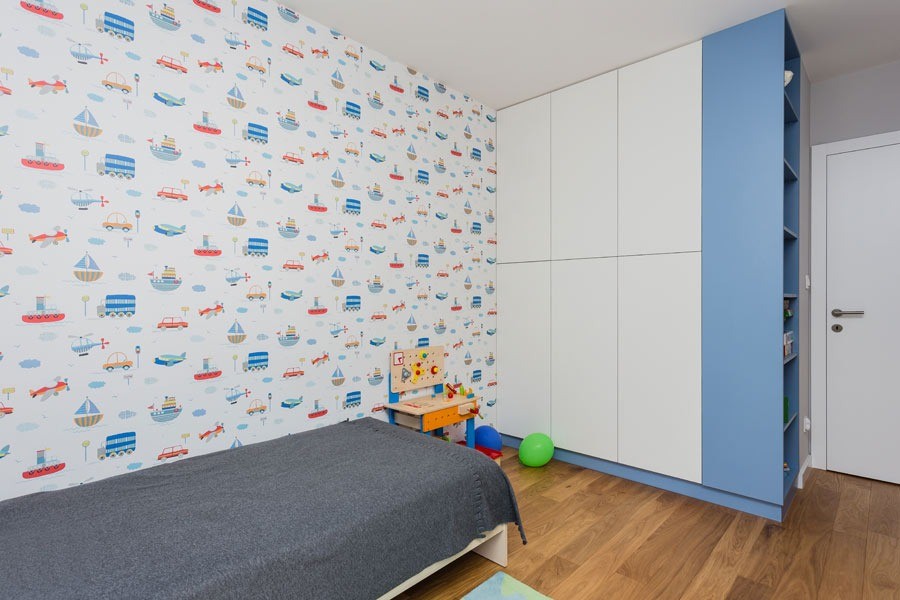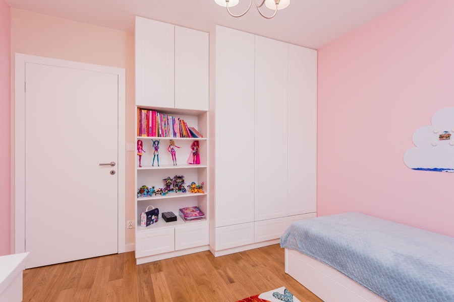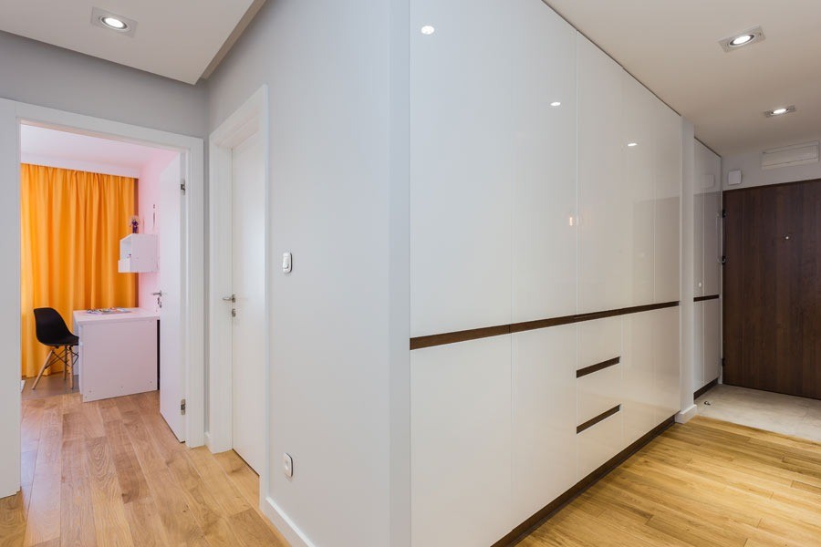 Projektant wnętrz otrzymał zadanie stworzenia nowoczesnego i przytulnego mieszkania na Białołęce dla pięcioosobowej rodziny. Wszystkie elementy aranżacji wnętrz zostały zaplanowane tak, aby tworzyć naturalną i neutralną atmosferę. Dominującymi barwami są biel, beże i szarości, które nadają wnętrzom elegancji i spokoju. Jednakże, w pokojach dzieci można zauważyć nieco bardziej bogatą kolorystykę, która dodaje energii i radości.