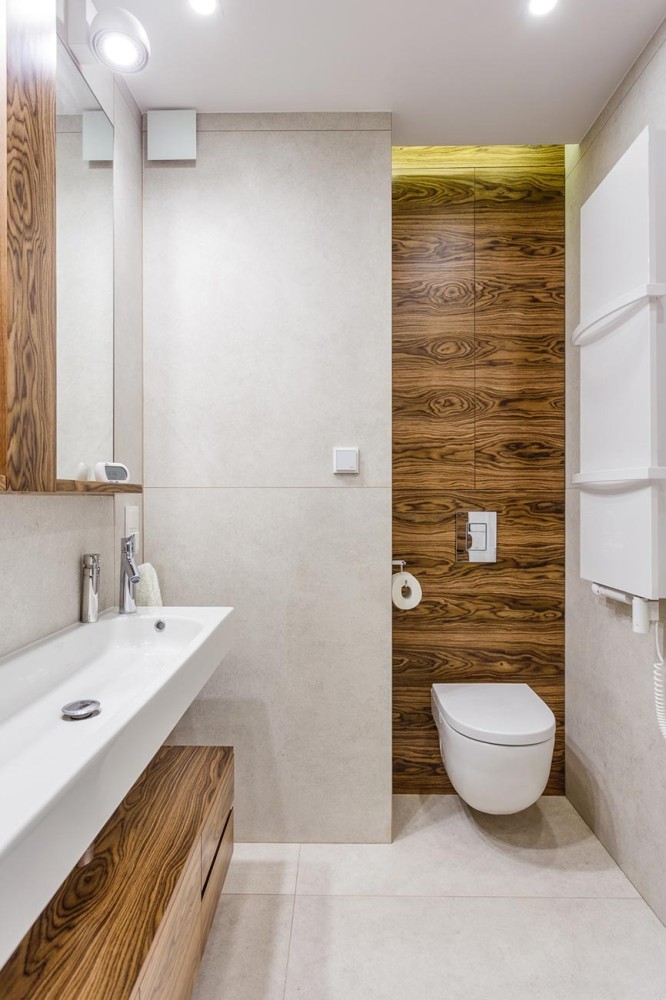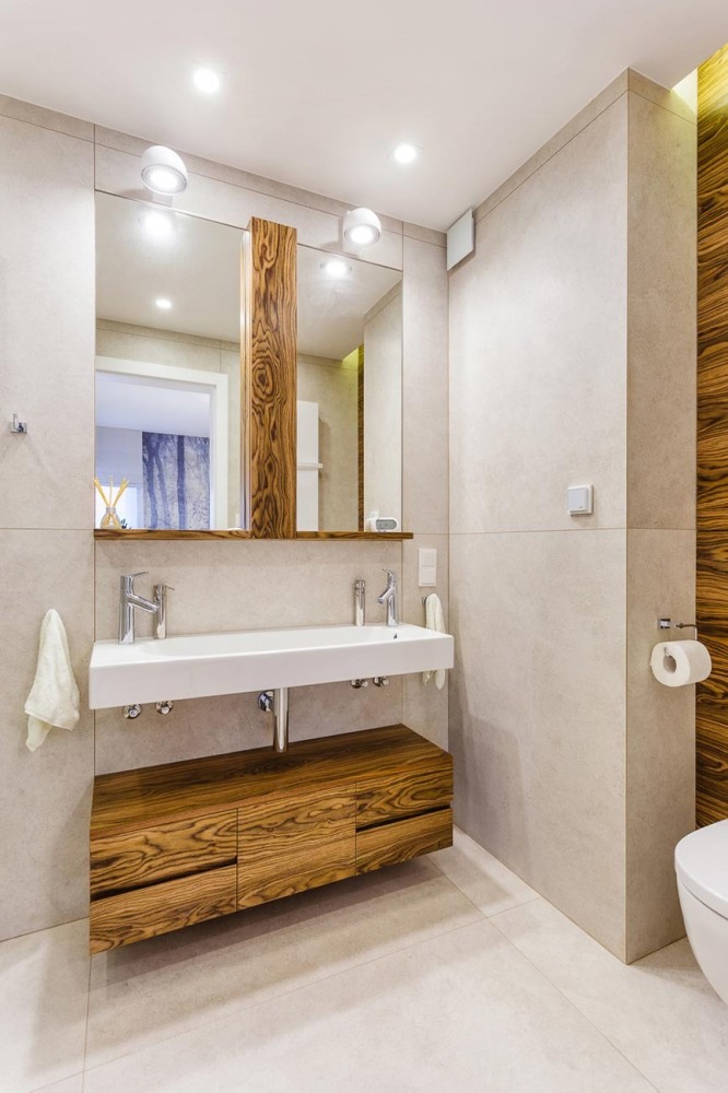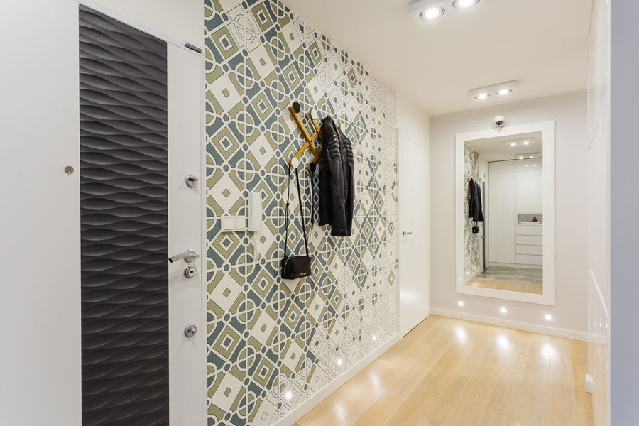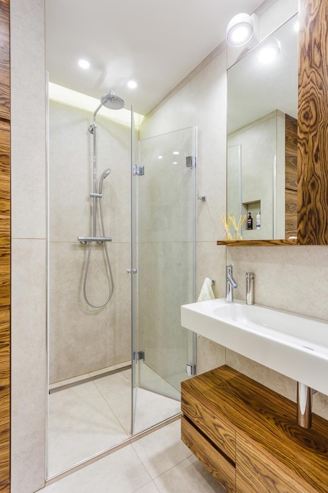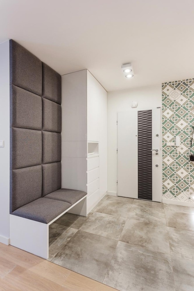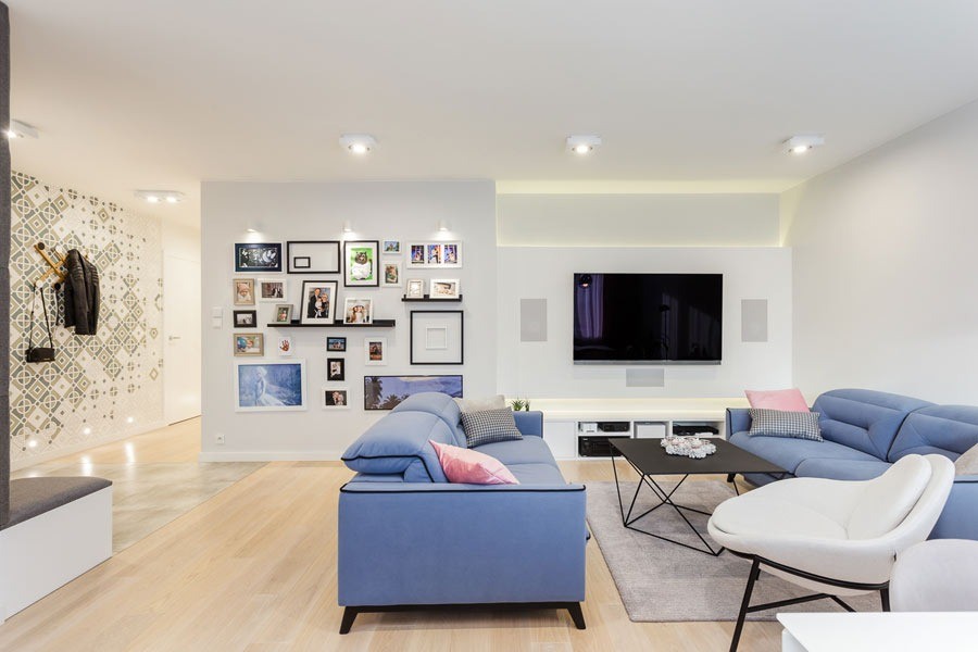 Remont wymagał wielu wyburzeń i zmian w instalacjach. Wnętrze mieszkania zostało zbudowane niemal na nowo. Salon z jadalnią bardzo duży, otwarty na przedpokój wita otwartą jasną przestrzenią. W aranżacji kuchni został wykorzystany każdy centymetr pomieszczenia – nie brakuje blatu roboczego i mamy miejsce na dodatkowy blat z hokerami.