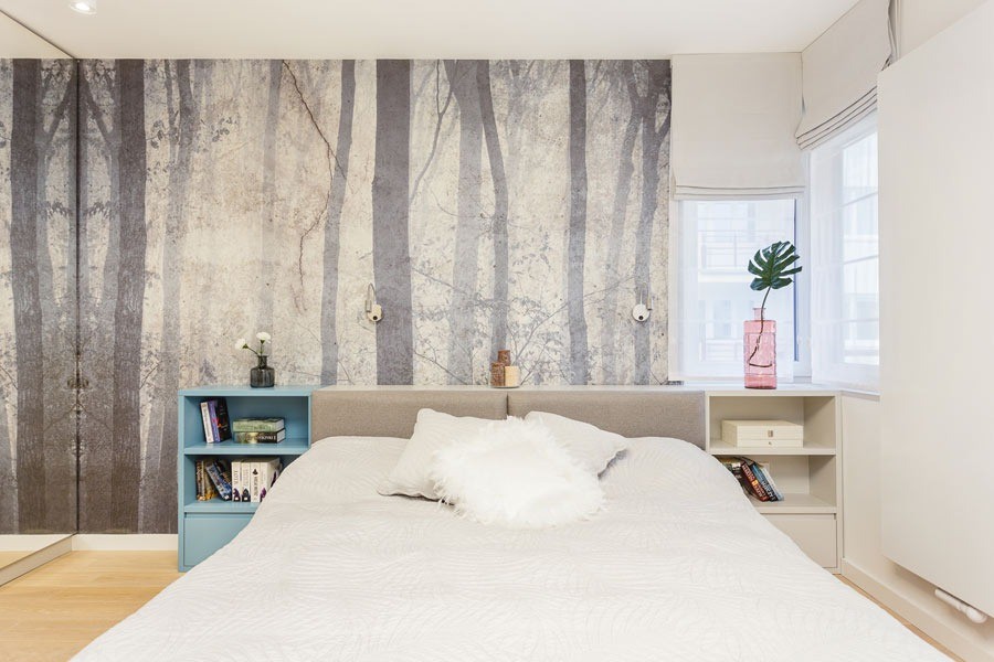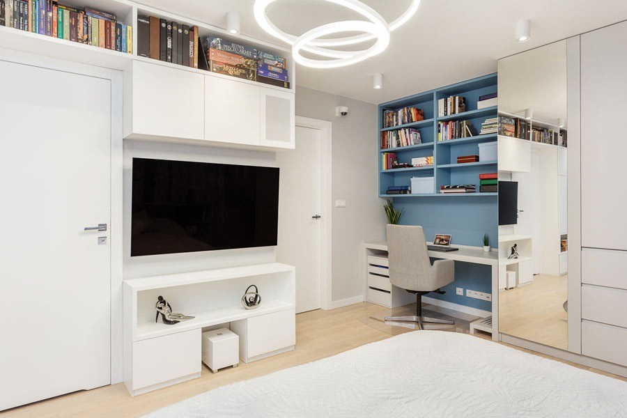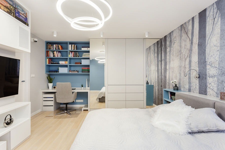 W równie dużej sypialni zaprojektowano dużą szafę, biblioteczkę, duże łóżko oraz miejsce do pracy. W sypialni jest również łazienka z prysznicem.
