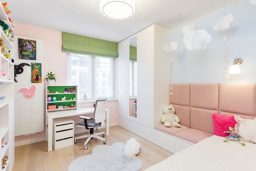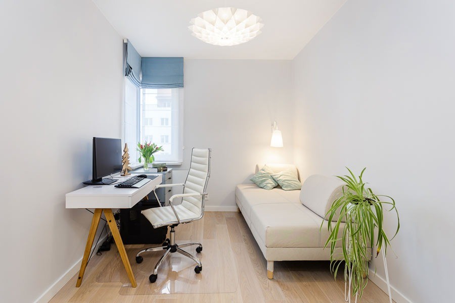 W pokoju córki Inwestorów mamy bardzo dużo miejsca na przechowywanie, biurko do nauki i duże wygodne łóżko z panelami tapicerowanymi. Kolejny pokój pełni funkcję gabinetu. Wisienką na torcie jest kolorowa łazienka z wanną i dwiema umywalkami.