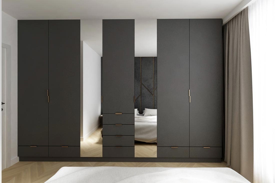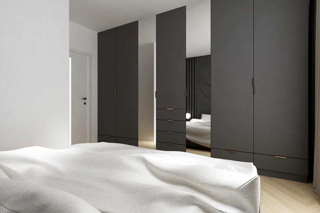 Sypialnia wyróżnia się wysokim, geometrycznym wezgłowiem z czarnego welwetu ze złotymi akcentami. Naprzeciw łóżka stoi duża, czarna szafa z antracytowymi frontami i złotymi uchwytami.