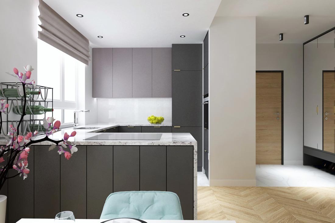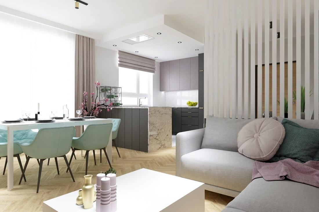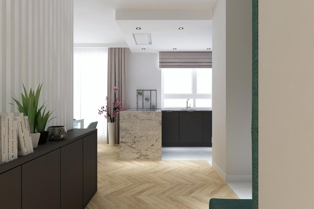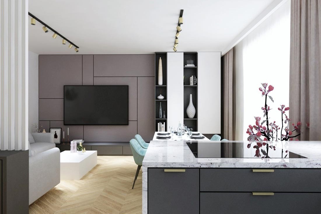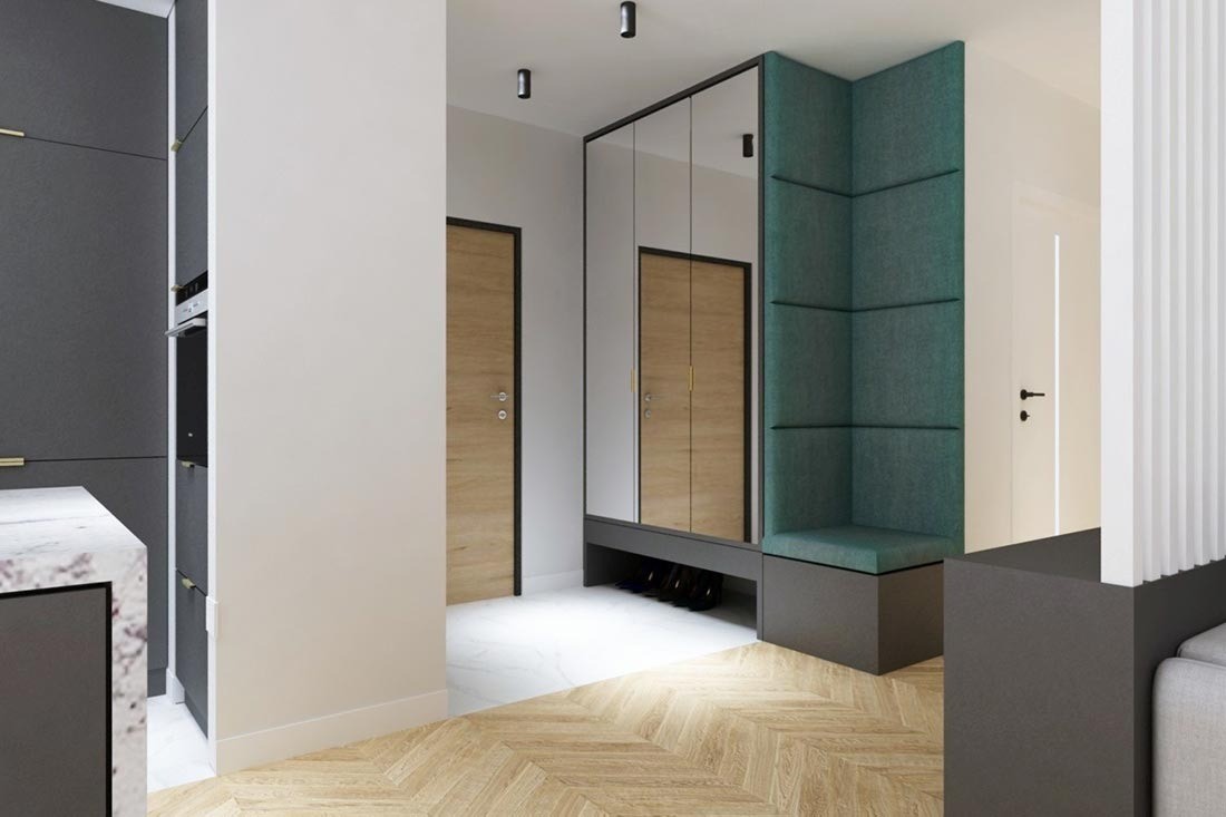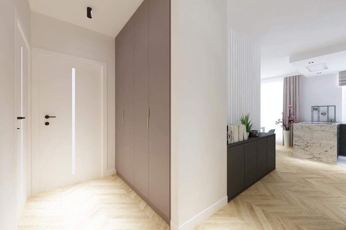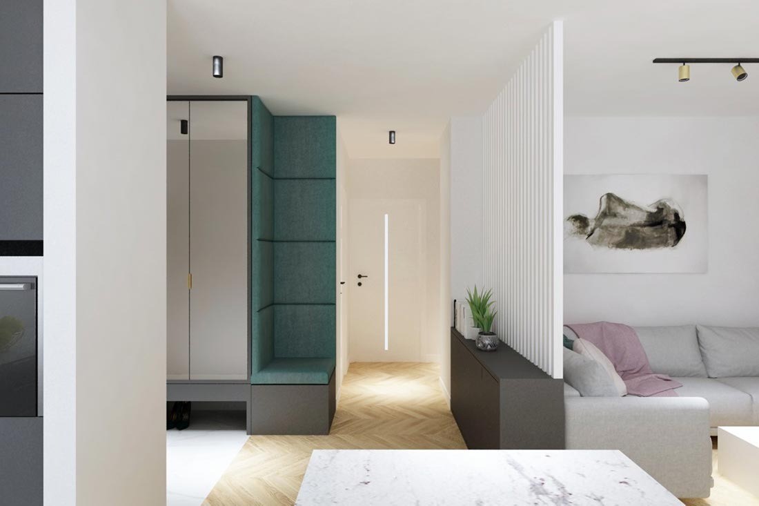 Mieszkanie na warszawskim Targówku zaprojektowano w nowoczesnym stylu. Wnętrza są proste, eleganckie i wyjątkowo funkcjonalne, z subtelnymi akcentami kolorystycznymi i kontrastami.
