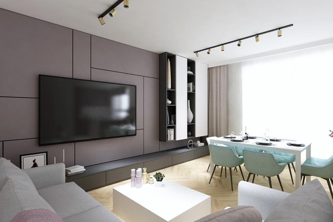 Na głównej ścianie salonu znajduje się zabudowa meblowa w trzech dominujących kolorach, pełniąca funkcję ścianki RTV i miejsca do przechowywania.