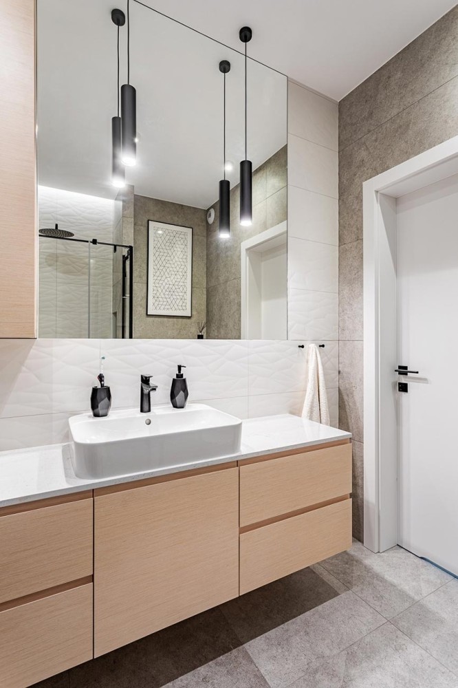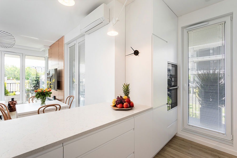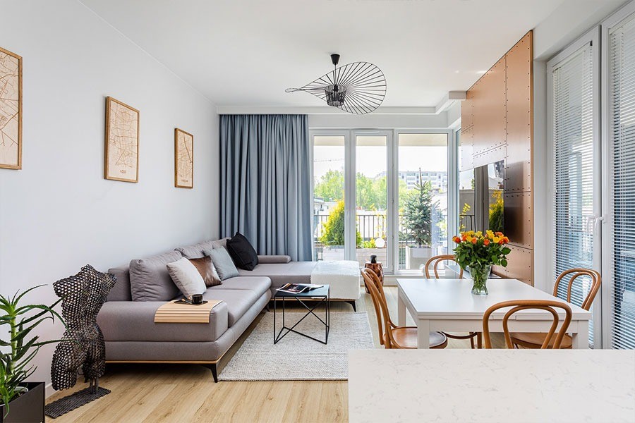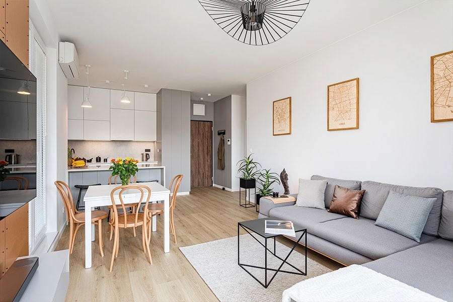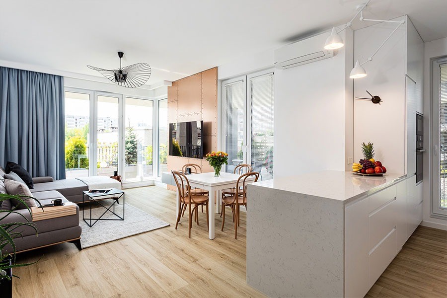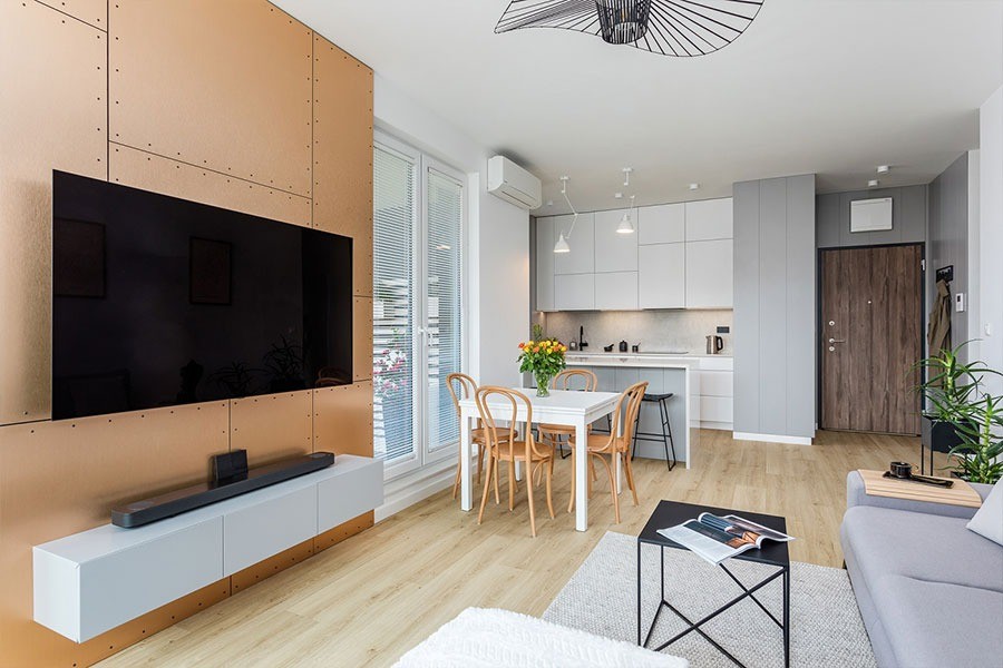 Mieszkanie o takiej powierzchni oferuje wiele możliwości aranżacyjnych. Projektant wnętrz wykorzystał ten potencjał, tworząc przestronne i funkcjonalne pomieszczenia. Salon stał się miejscem spotkań i relaksu, gdzie biel ścian doskonale współgra z drewnianymi meblami i złotymi akcentami. Kuchnia, połączona z jadalnią, została urządzona w nowoczesnym stylu, z licznymi szafkami i blatami w kolorze szarości. Sypialnia to oaza spokoju, gdzie dominuje biel, a delikatne dodatki w kolorze miedzi nadają jej wyjątkowego uroku.