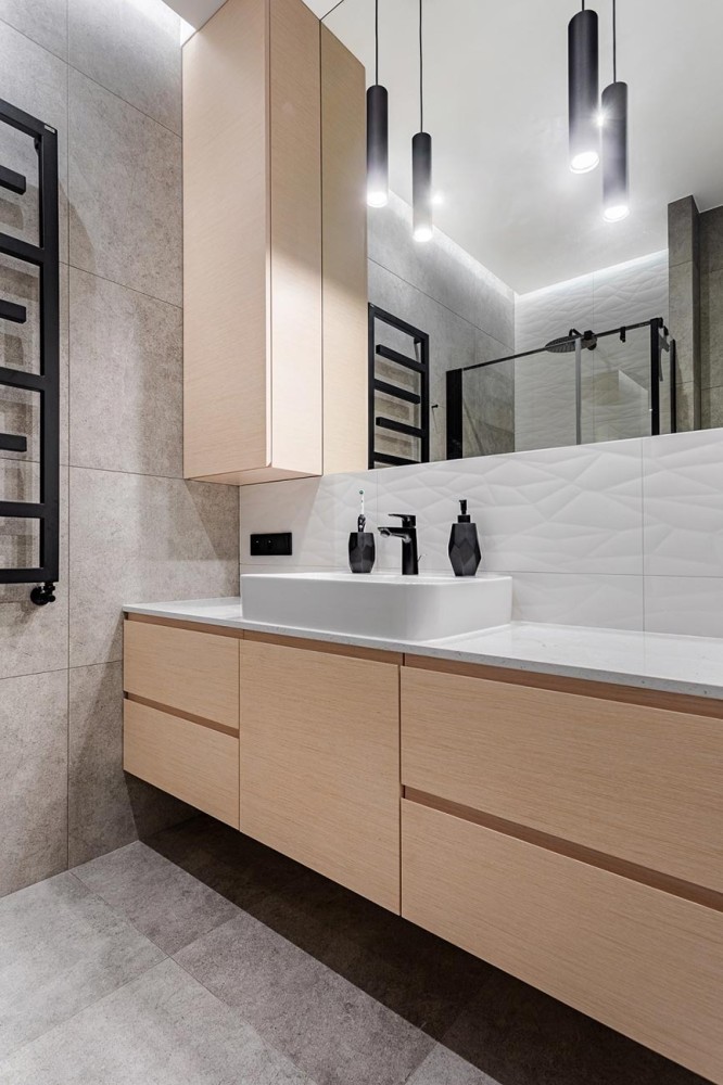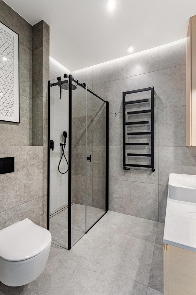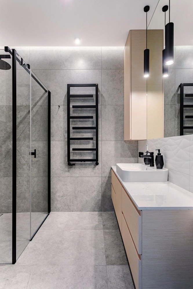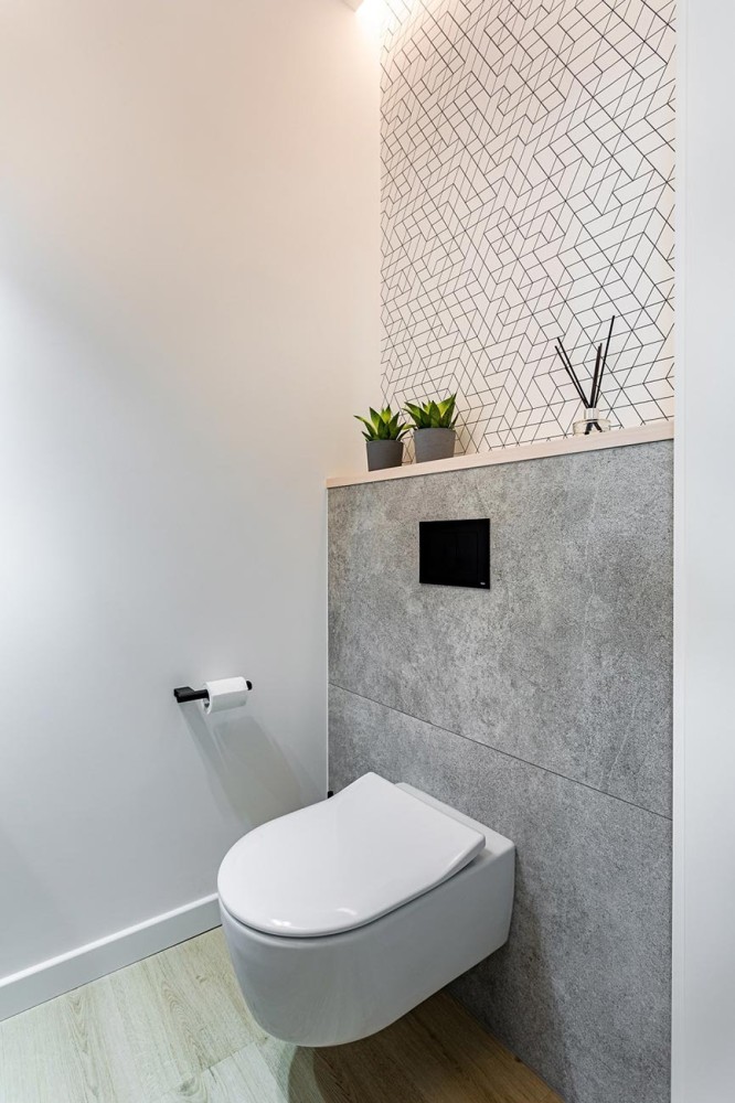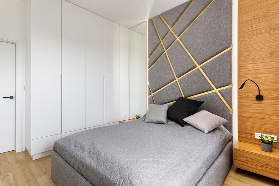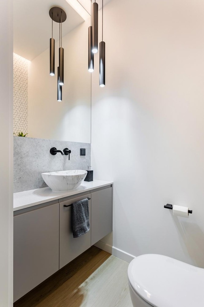 Inwestorka od samego początku wyraziła swoją miłość do kolorów bieli i szarości. Te delikatne odcienie stały się podstawą aranżacji, tworząc idealne tło do wprowadzenia prostych brył oraz geometrycznych wzorów. Przestrzeń została ożywiona za pomocą elementów w kolorze drewna, miedzi i złota, dodając tym samym nuty elegancji i luksusu.