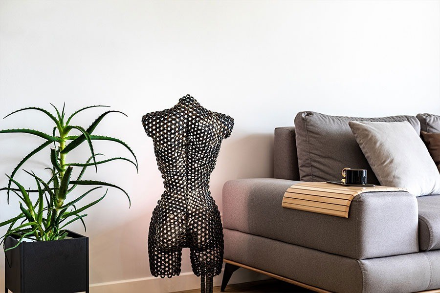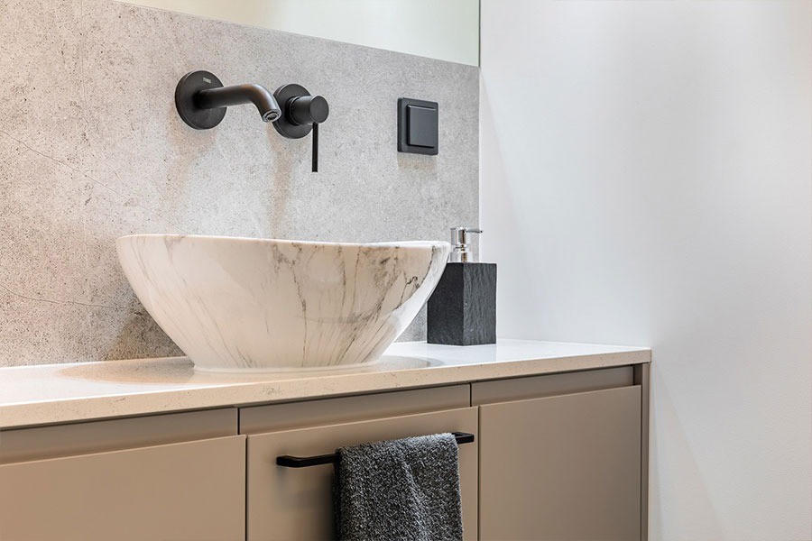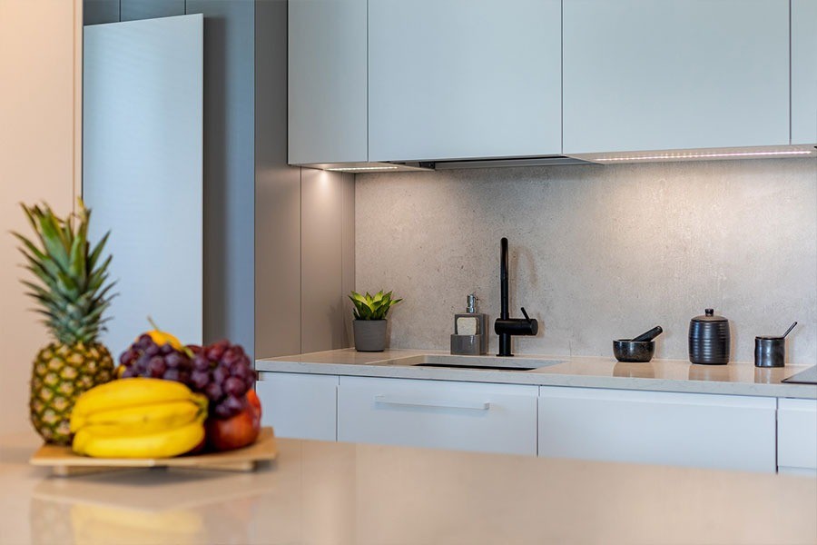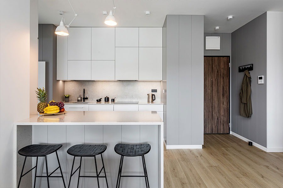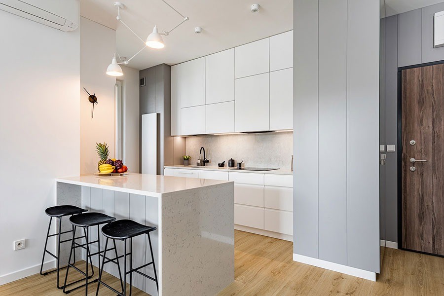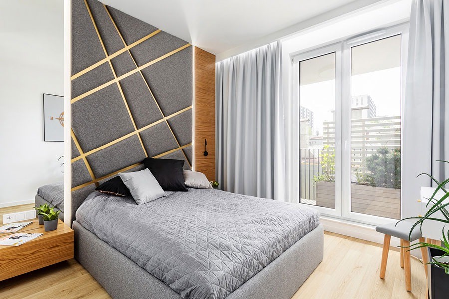 Inwestorka od samego początku wyraziła swoją miłość do kolorów bieli i szarości. Te delikatne odcienie stały się podstawą aranżacji, tworząc idealne tło do wprowadzenia prostych brył oraz geometrycznych wzorów. Przestrzeń została ożywiona za pomocą elementów w kolorze drewna, miedzi i złota, dodając tym samym nuty elegancji i luksusu.