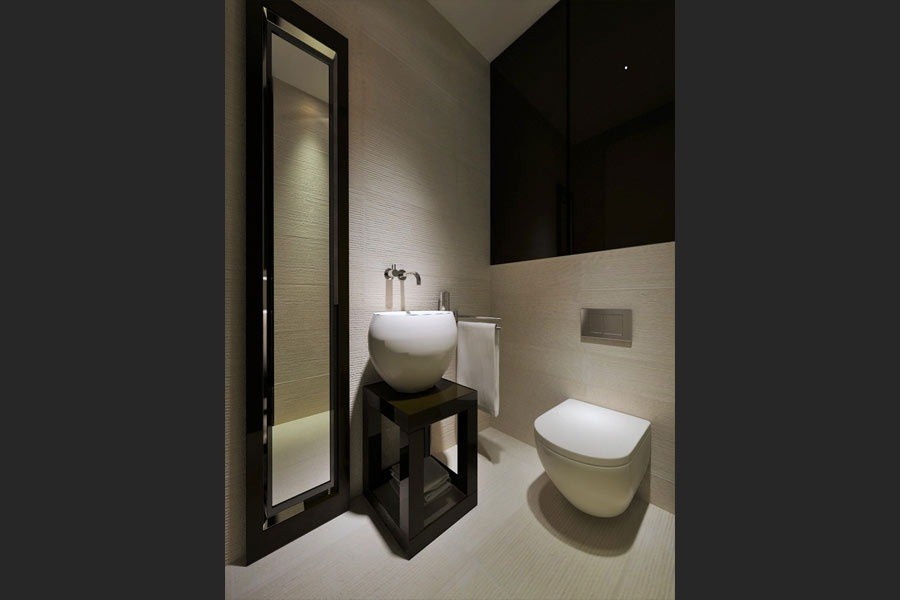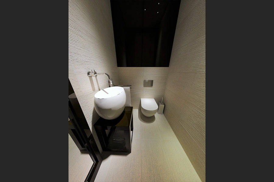 Podobnie jak w sypialni, projekt wc również odznacza się minimalistyczną stylistyką. Tutaj projektant zadbał przede wszystkim o funkcjonalność i wygodę użytkowania. Pomieszczenie jest bardzo oszczędne w formie, a jednocześnie pełne nowoczesnych rozwiązań. Jasne kolory ścian oraz białe meble sprawiają, że wc wydaje się jeszcze bardziej przestronne i eleganckie. Wszystkie elementy zostały starannie dobrane, aby zapewnić mieszkańcom maksymalny komfort i wygodę.