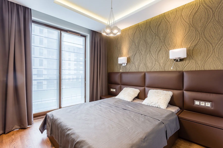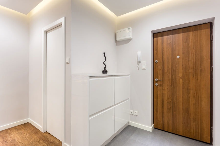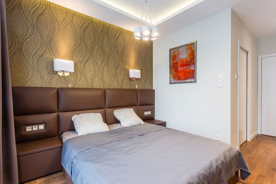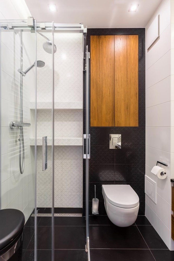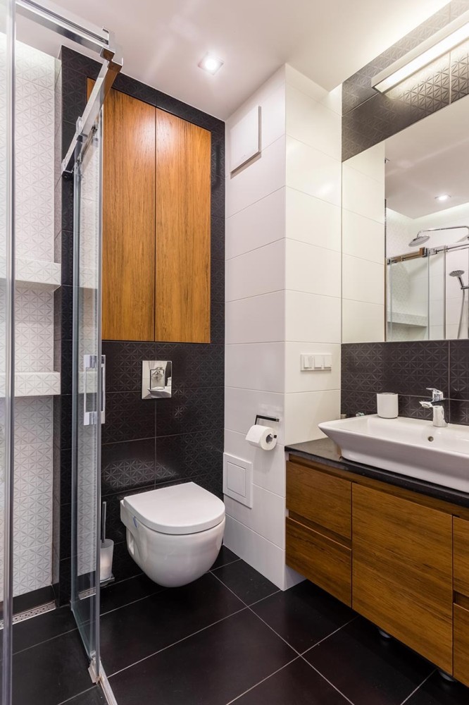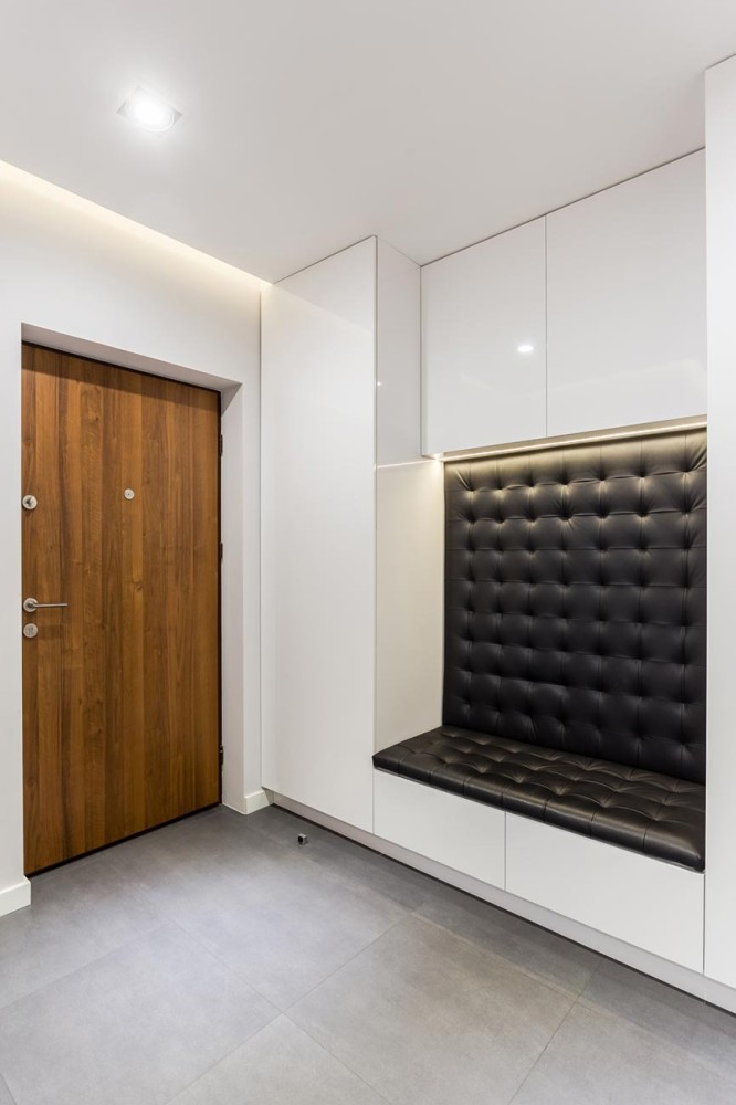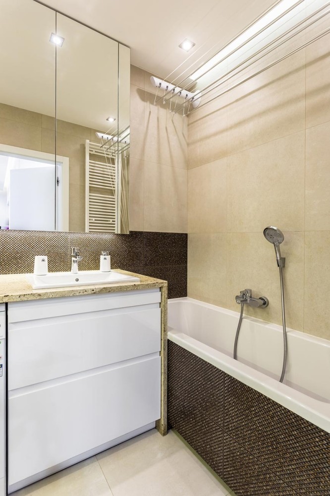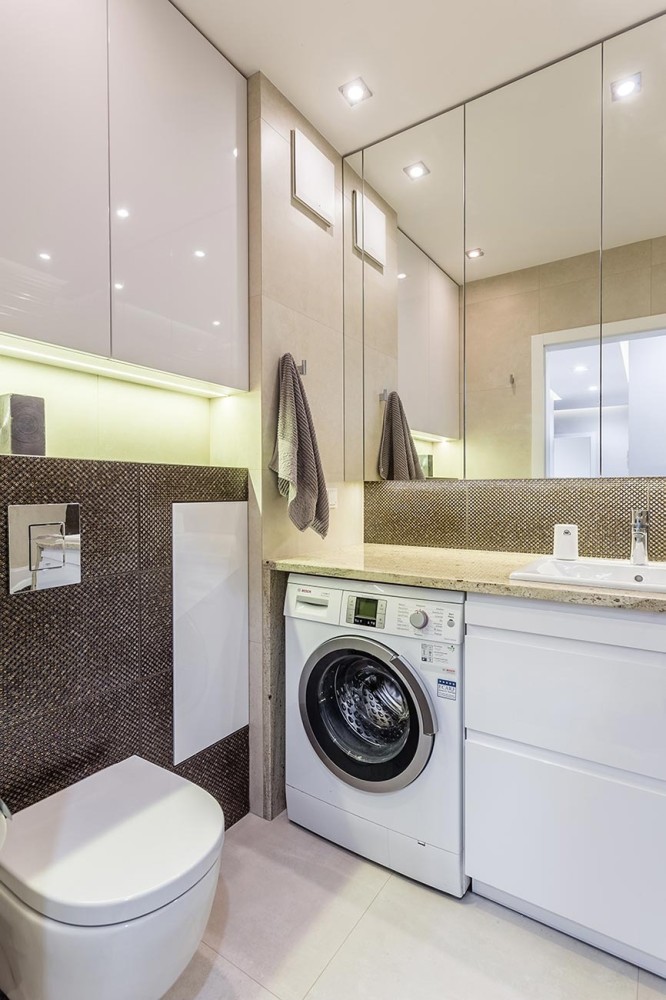 W łazience w sypialni zaprojektowano prysznic, pojemną szafkę pod umywalką i nad wc. W drugiej łazience znajdziemy wannę oraz pralkę pod granitowym blatem obok umywalki. W aranżacji przedpokoju wykorzystano wnęki na duże szafy oraz skórzane siedzisko.