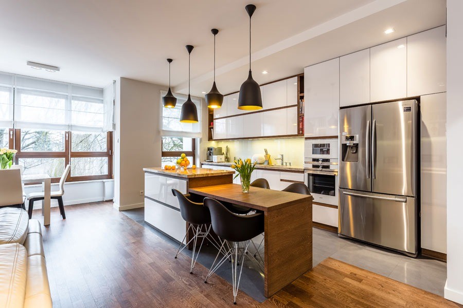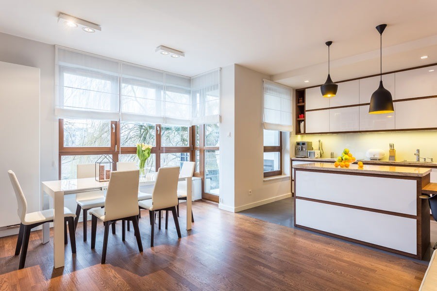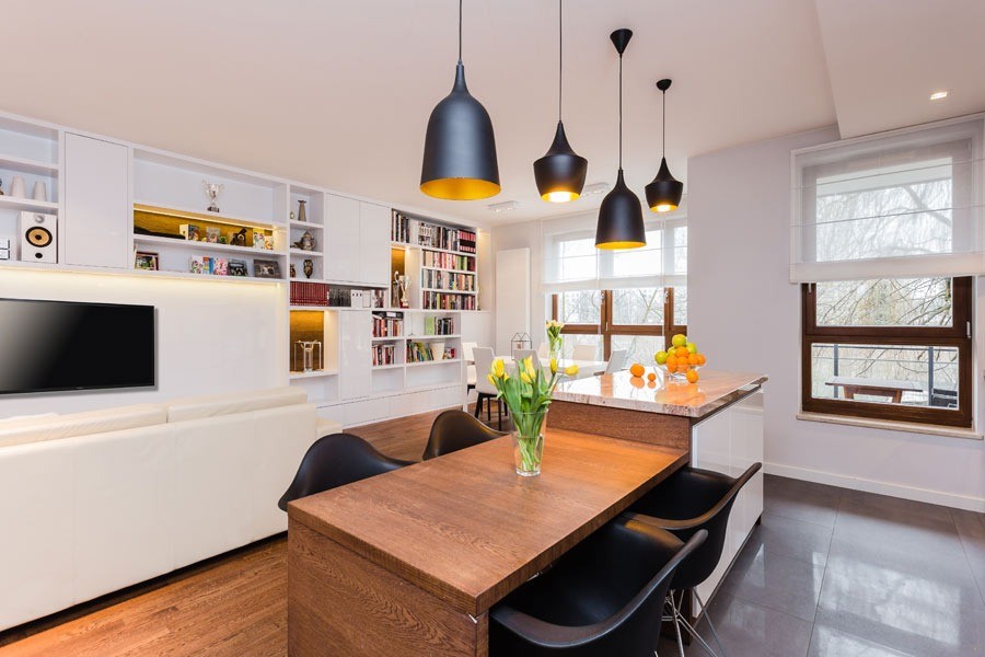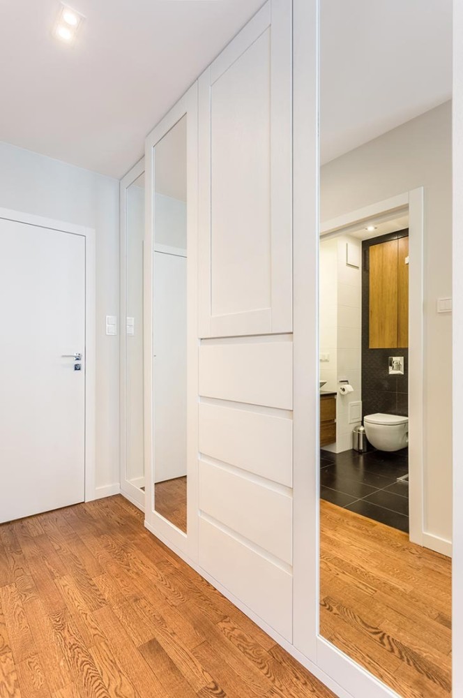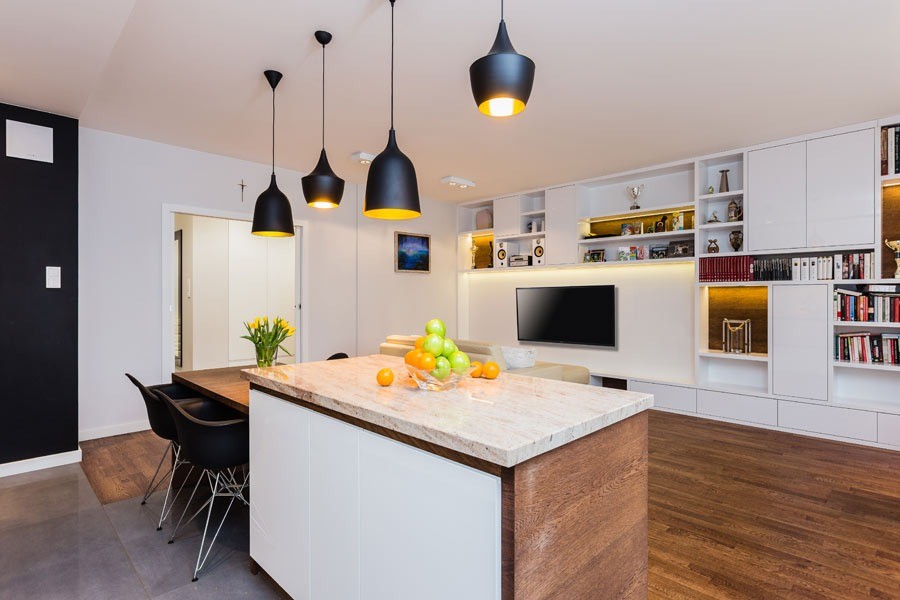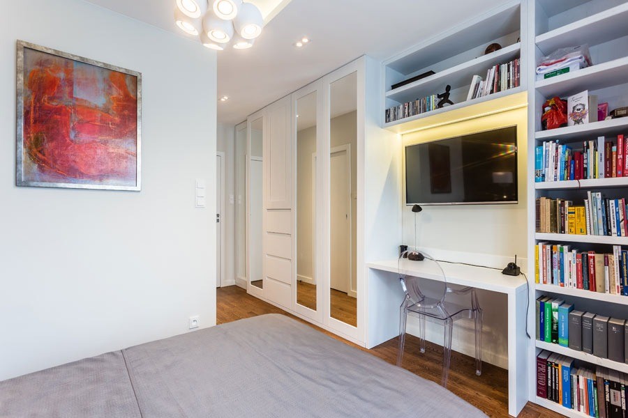 Apartament na Żoliborzu został zaaranżowany dla 4-osobowej rodziny. Dominującym kolorem jest biel na zabudowach meblowych i ścianach.
