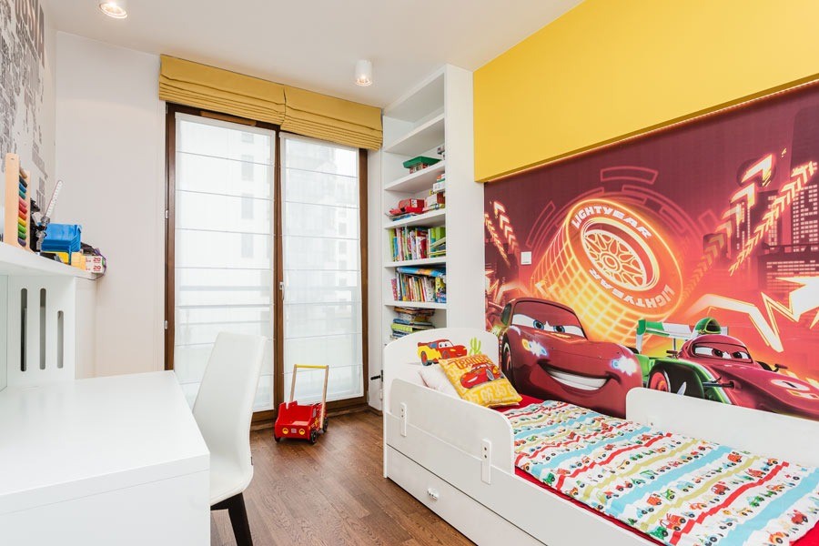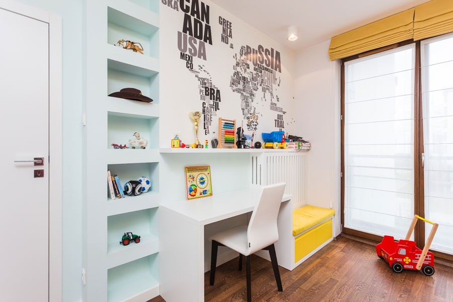 Kolor drewna na podłodze i części mebli dodaje przytulności i znakomicie przełamuje całość. Mieszkanie zostało zaprojektowane funkcjonalnie pod każdym względem. W pokojach dzieci nie brakuje miejsca na przechowywanie zabawek i ubrań oraz przestrzeni do nauki. Sypialnia rodziców oprócz podstawowej funkcjonalności pomieściła biurko i biblioteczkę.