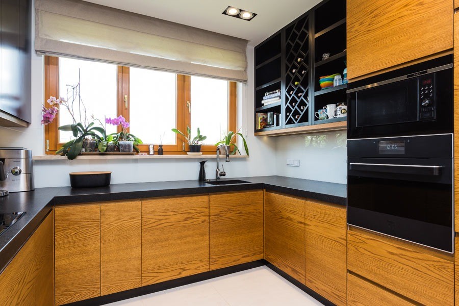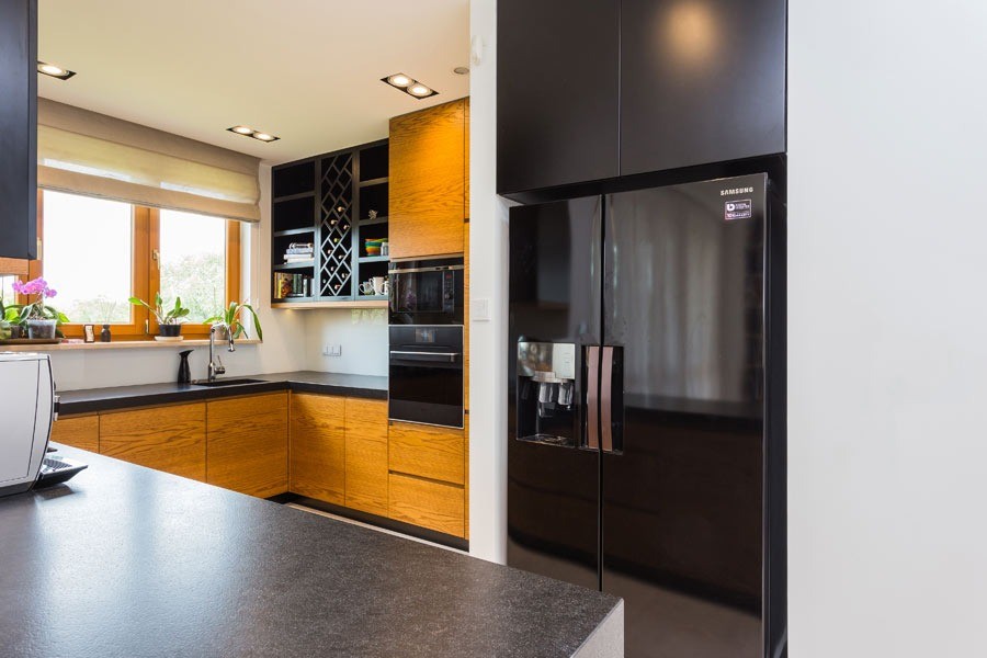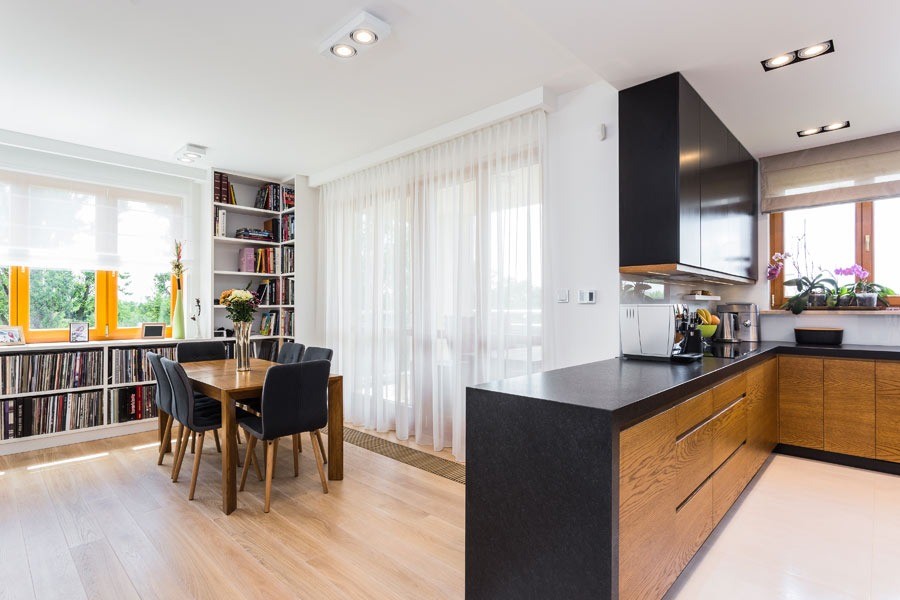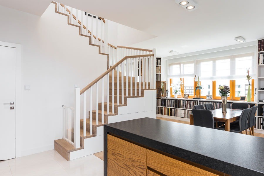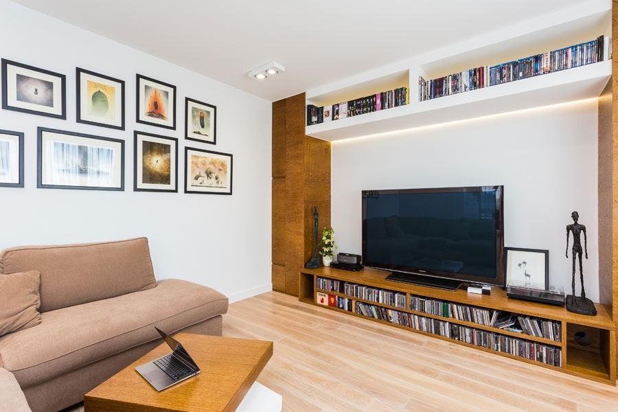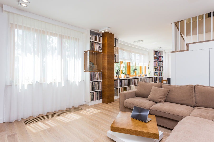 Na pierwszym poziomie znajduje się salon z aneksem kuchennym, przedpokój oraz łazienka, urządzone w ciepłych, przytulnych barwach. Wyjątkowym elementem dekoracyjnym salonu jest kolekcja płyt winylowych, która dodaje wnętrzu indywidualnego charakteru.
