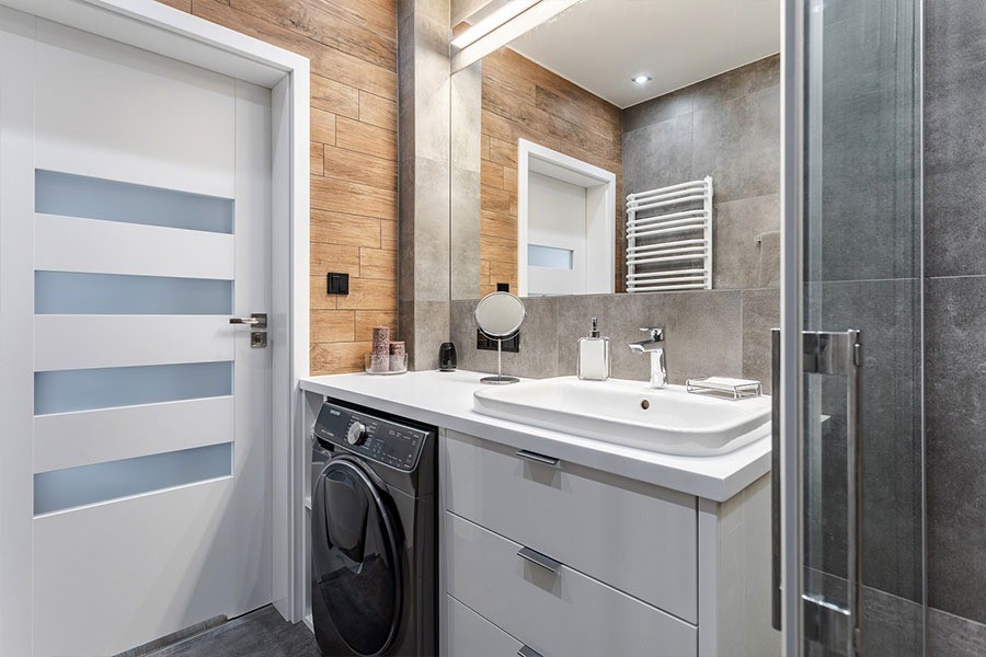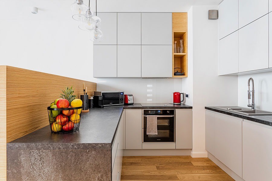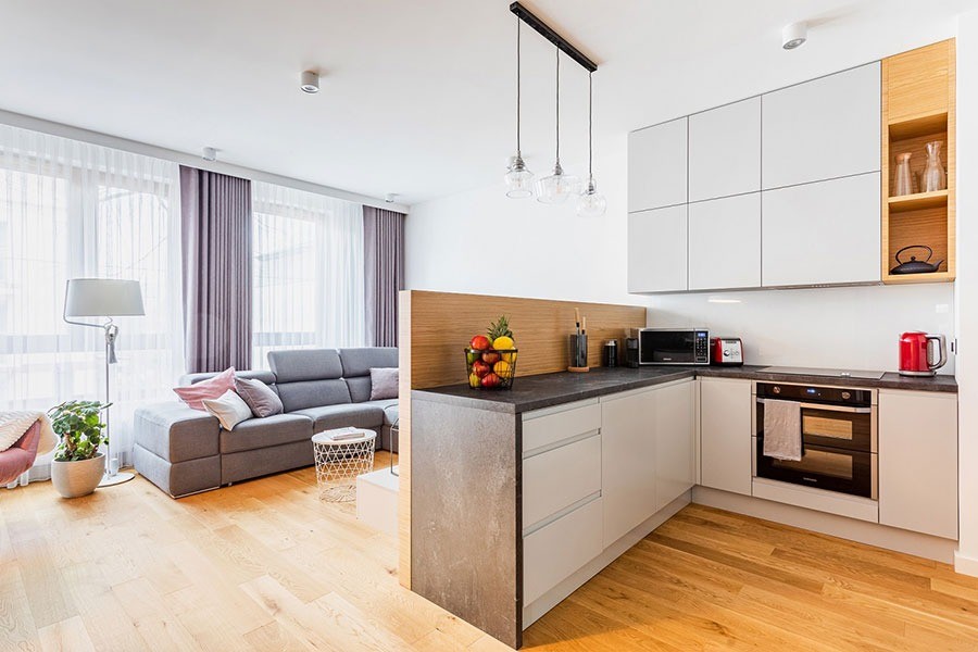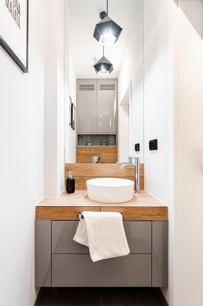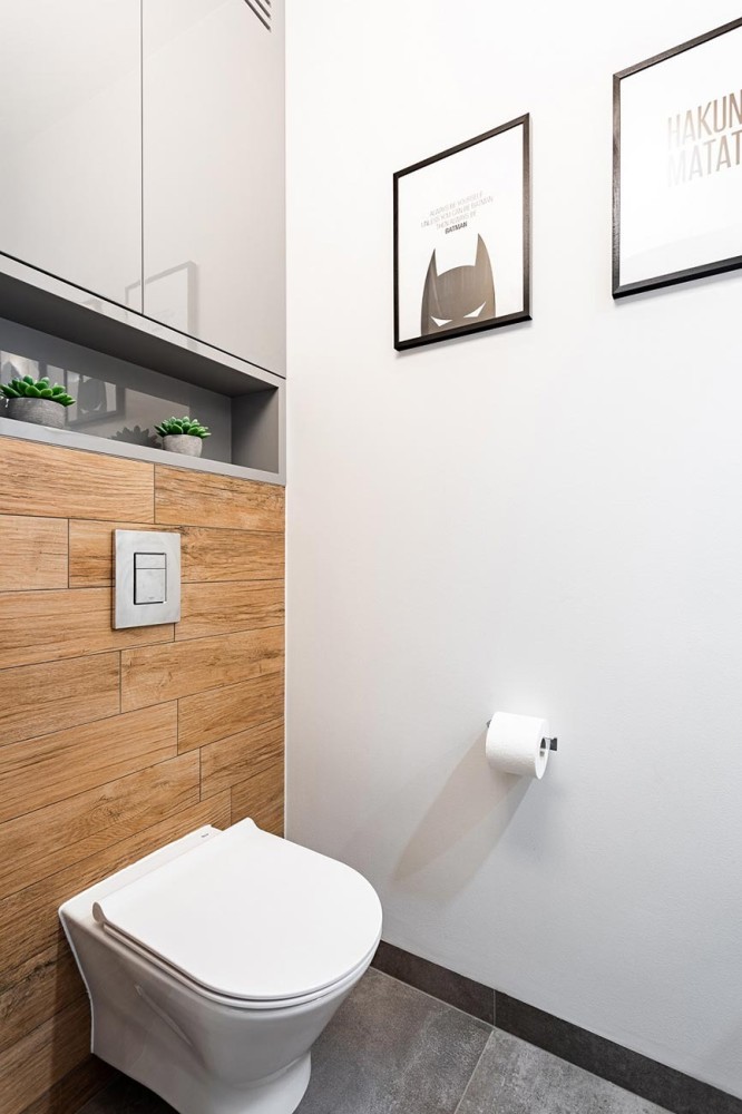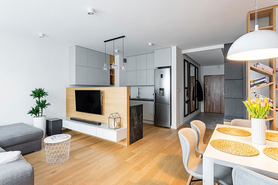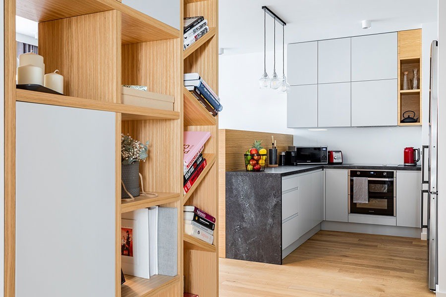 Projekt mieszkania we Włochach skupia się na jasnej, funkcjonalnej przestrzeni. Szarość połączona z drewnem tworzy ciepły, nowoczesny klimat. Przemyślane rozwiązania w salonie, kuchni, sypialni i łazience zapewniają wygodę i estetykę.